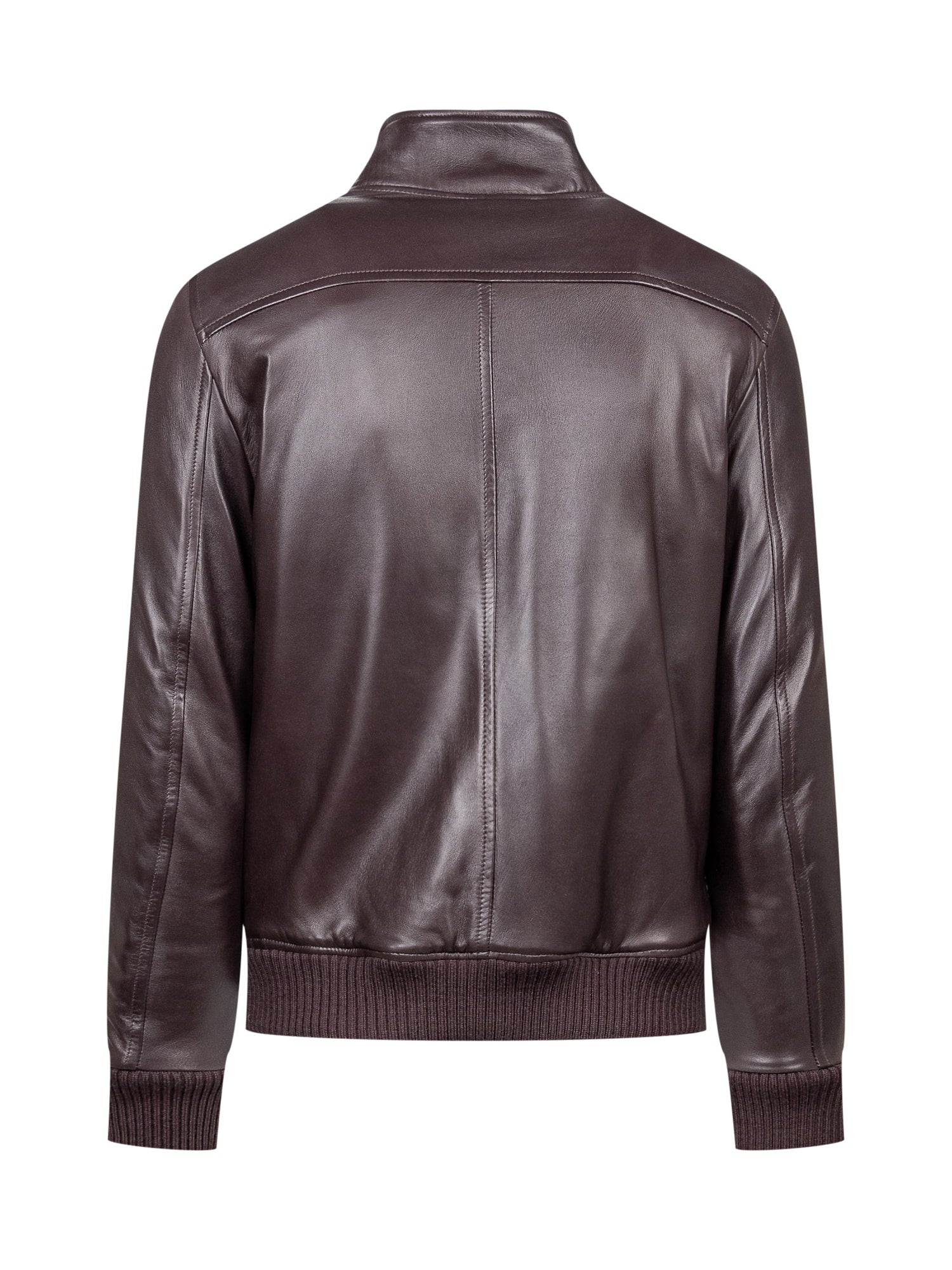 Nappa leather jacket with crew neck. Zipper and button closure. Two pockets. Ribbed hems.
