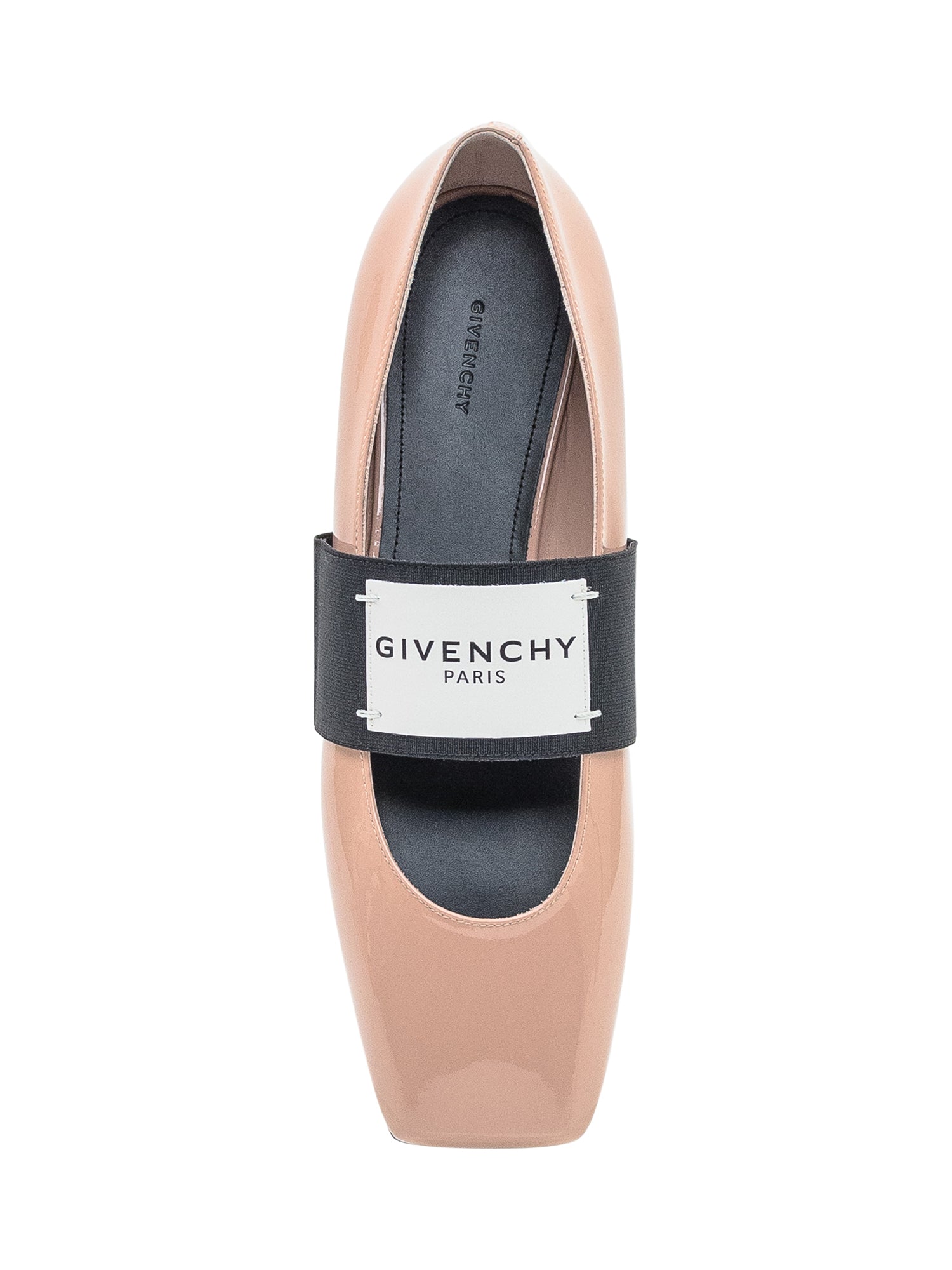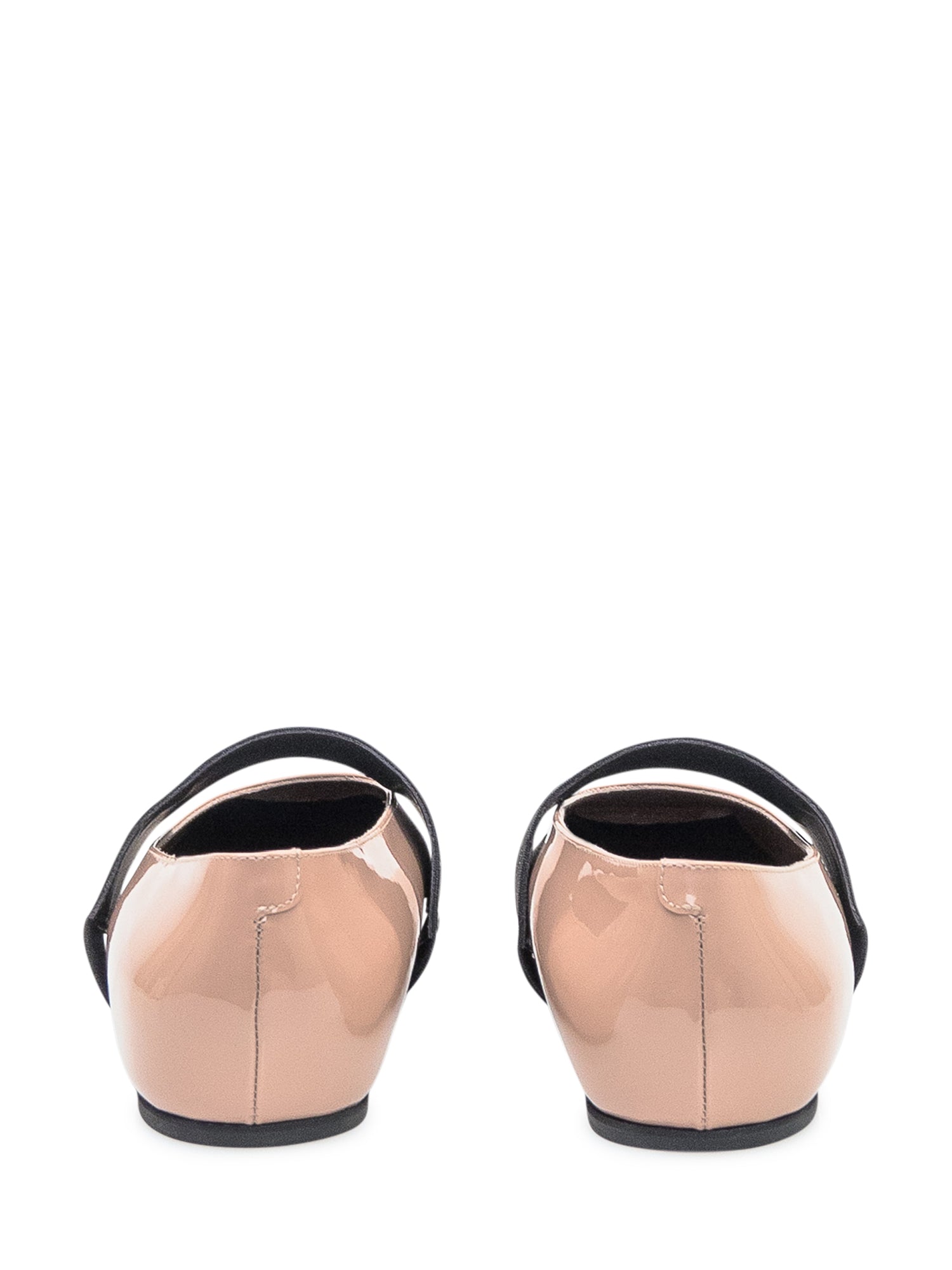Glossy ballet flats featuring an elastic logo strap across the instep.