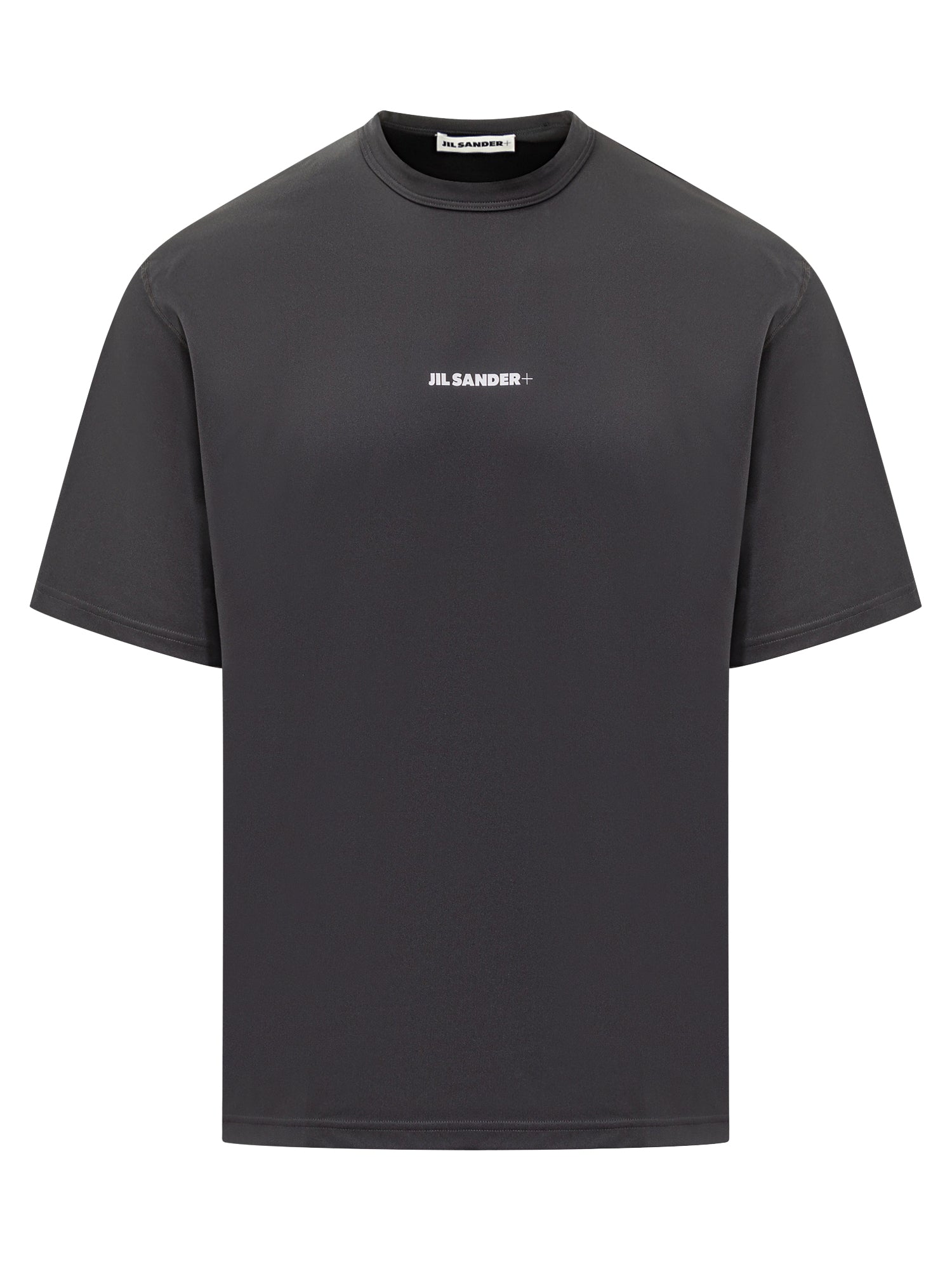 Minimal black cotton T-shirt featuring a centered white Jil Sander+ logo. A clean-cut silhouette.