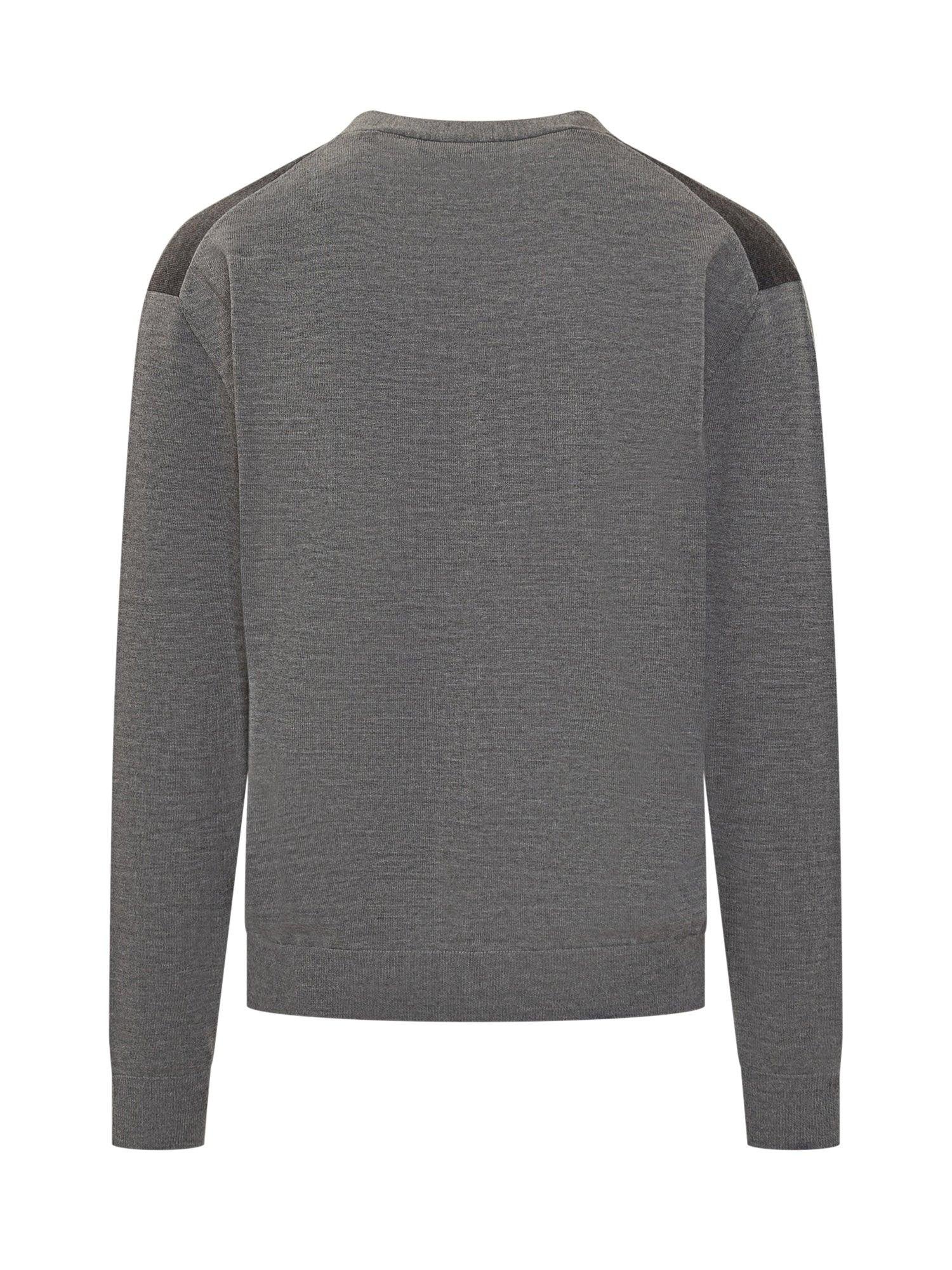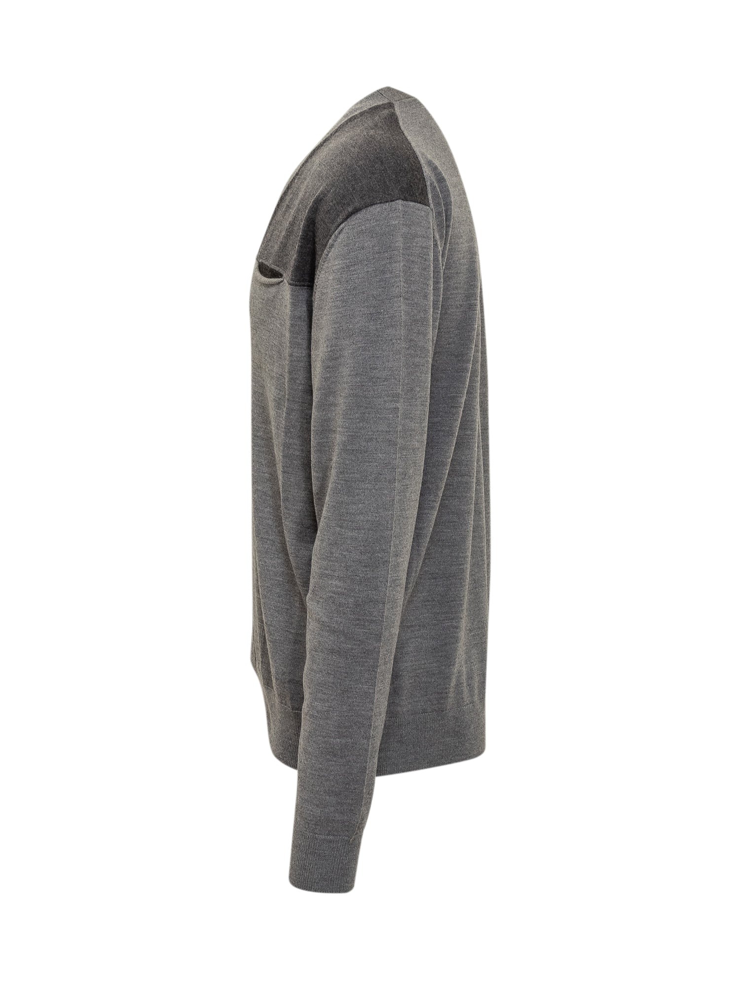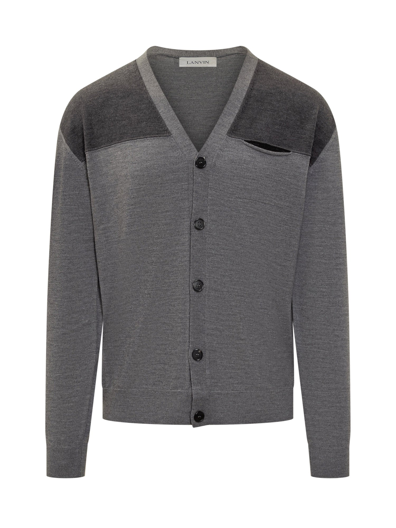 Lanvin grey wool cardigan with button closure, V-neckline and contrast details on shoulders and pocket.