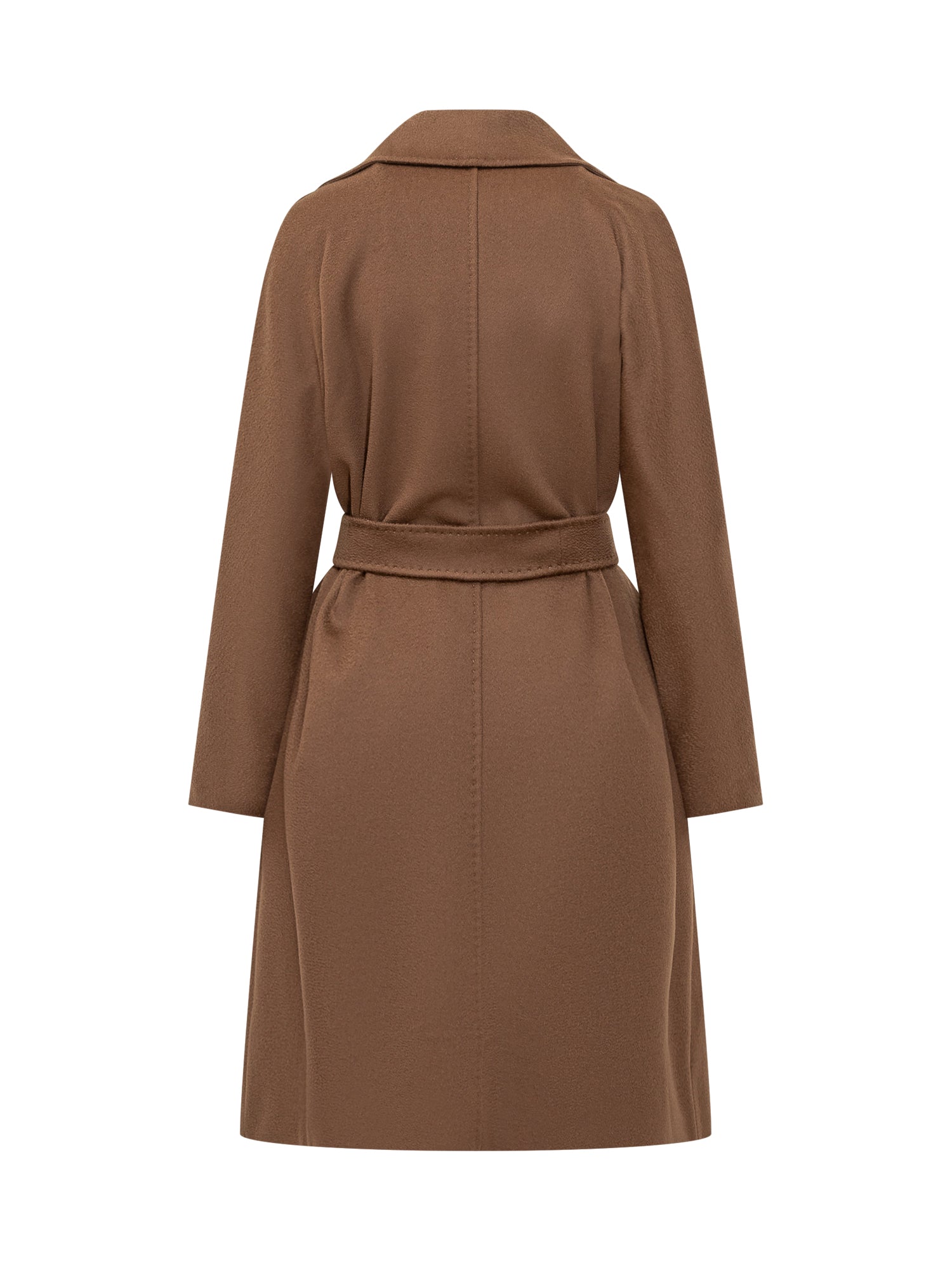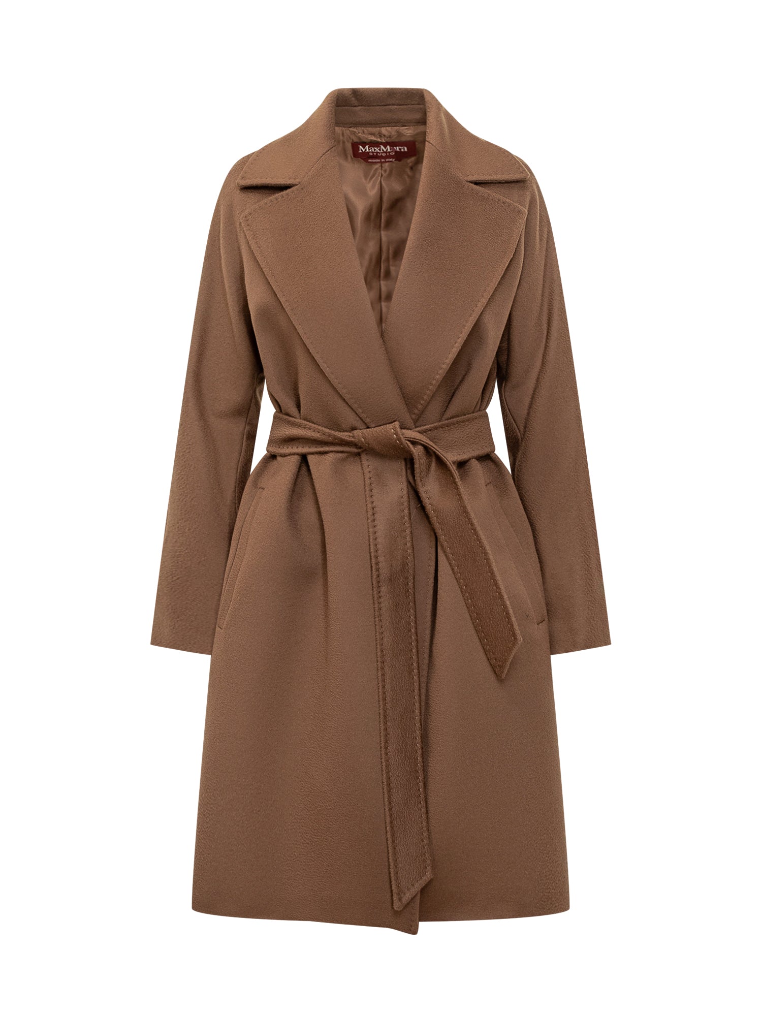 Max Mara Studio camel wool coat featuring a wrap design with matching waist belt. Classic lapels and side pockets.