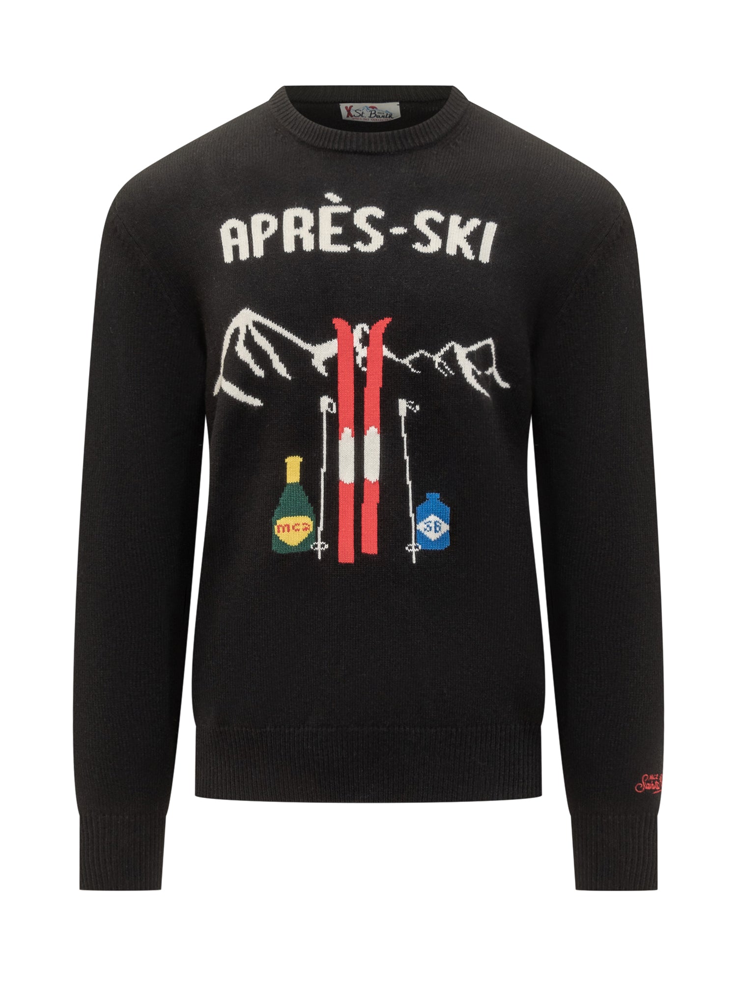 Saint Barth black sweater with Après-Ski graphic and colorful details.