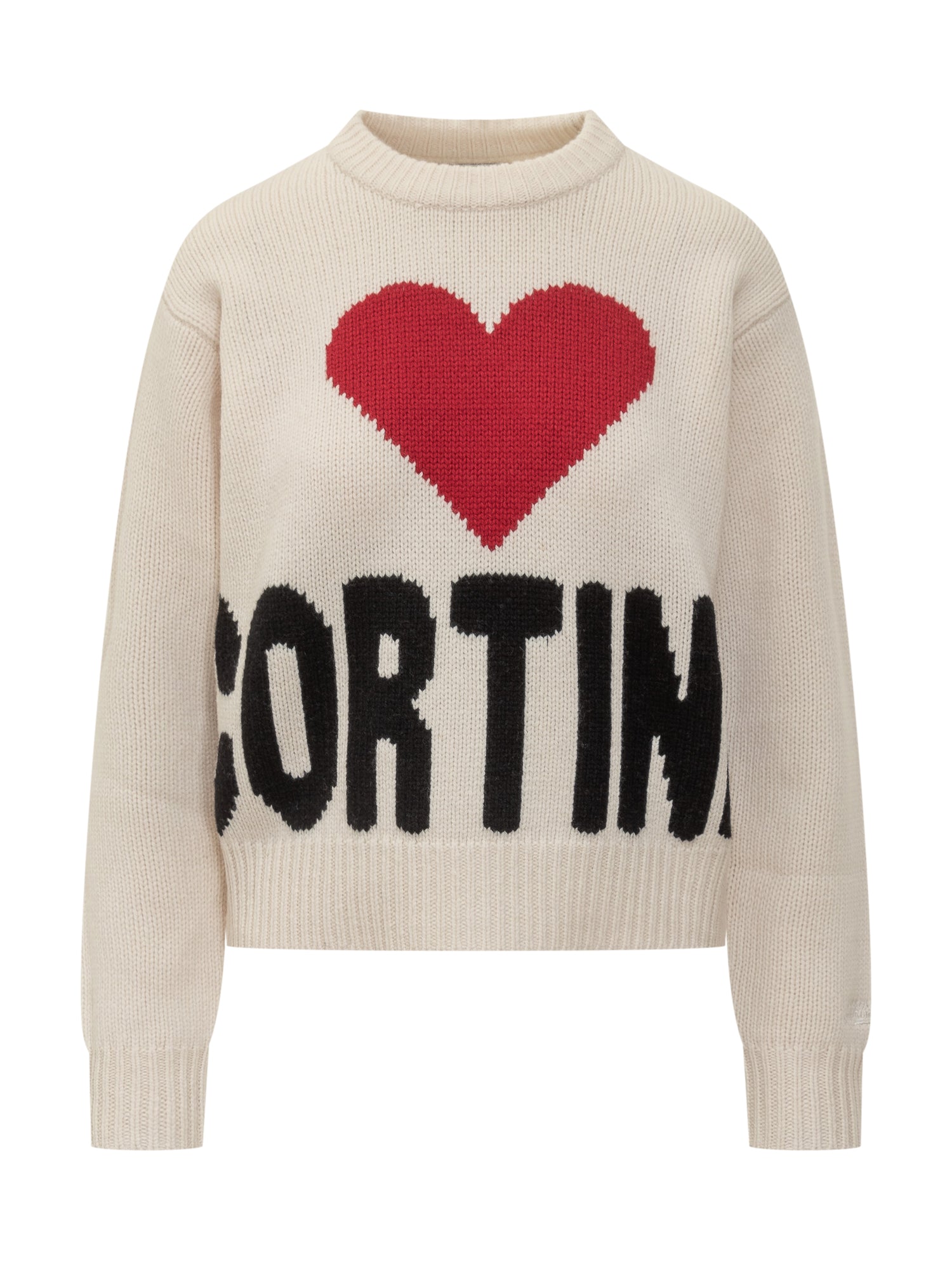 MC2 Saint Barth wool sweater in white with I Love Cortina graphic and red heart on the chest.
