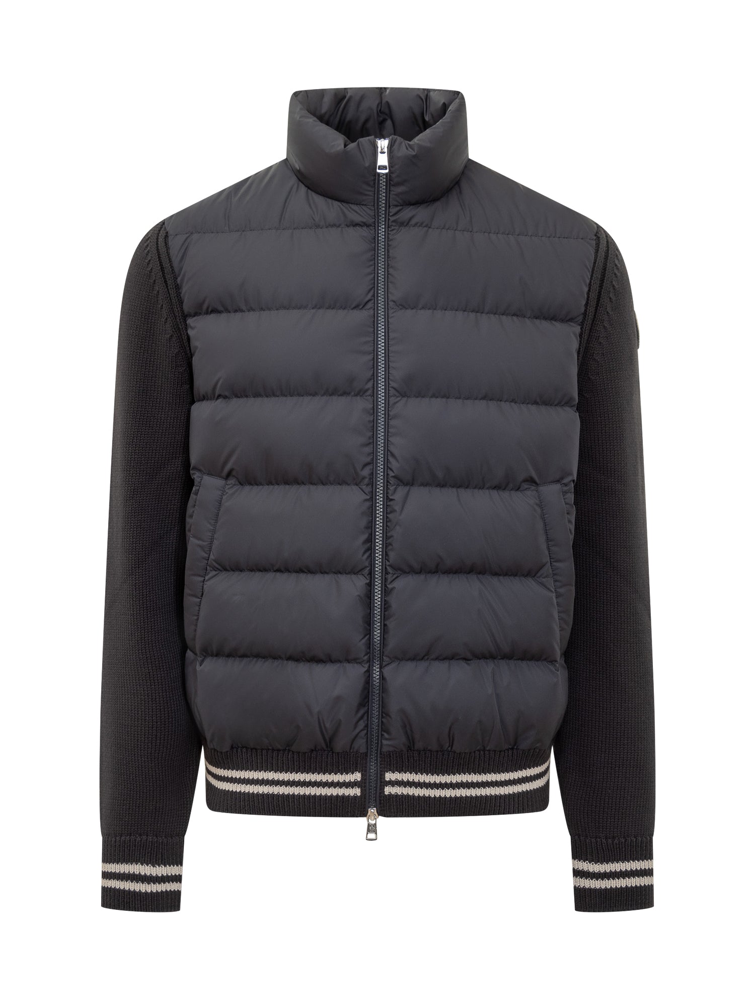 Moncler padded cardigan with knitted sleeves. Two-way front zip, ribbed cuffs and hem with contrast stripes.