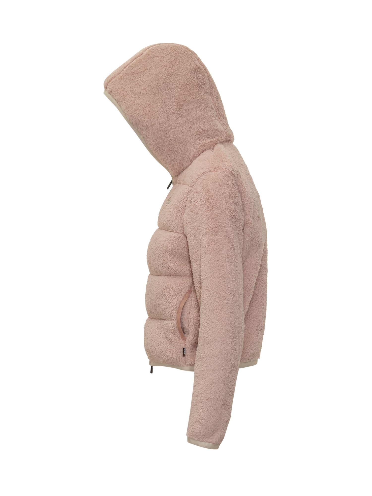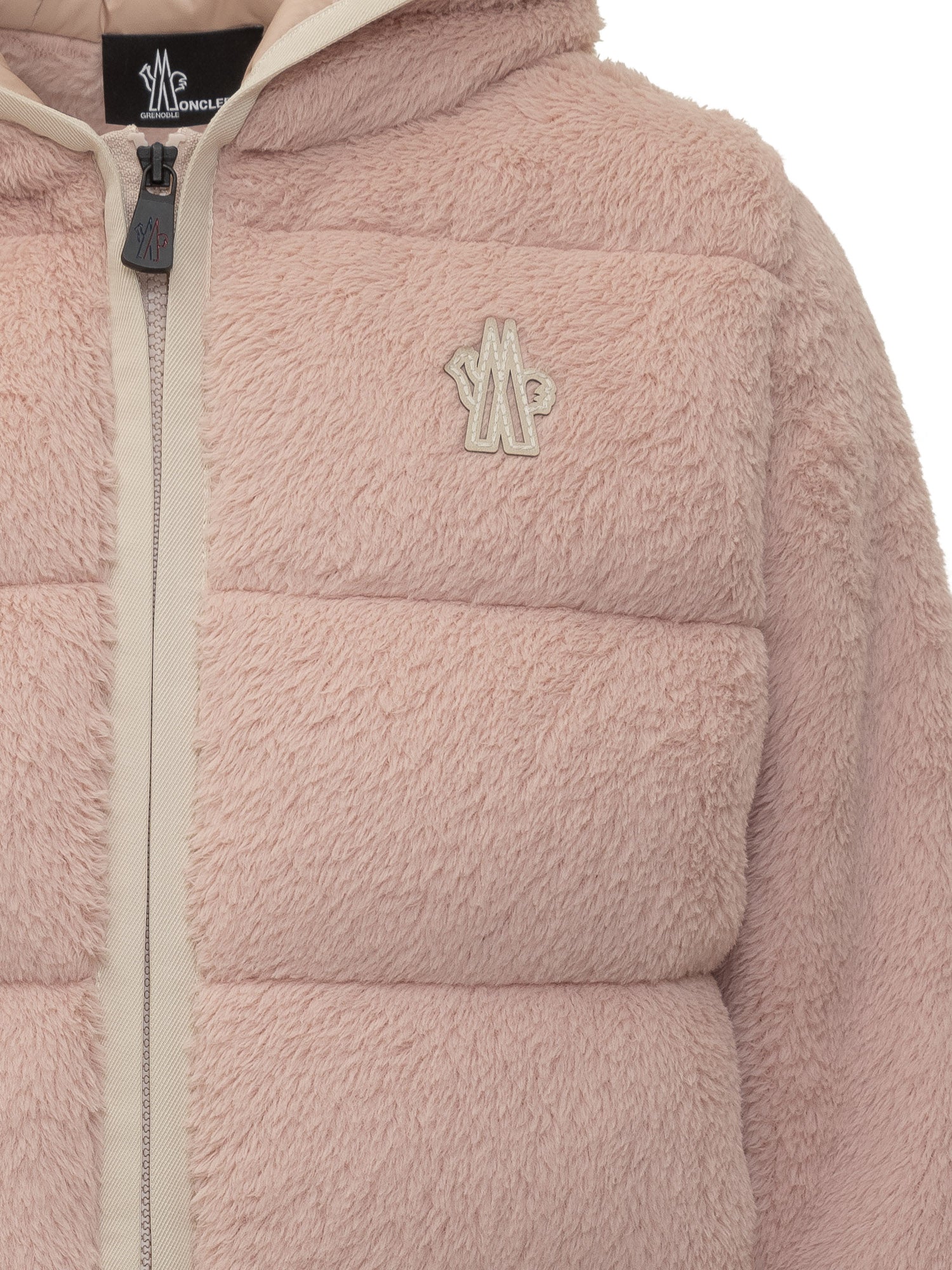 Moncler Grenoble pink down jacket with teddy-effect fabric and padded hood.