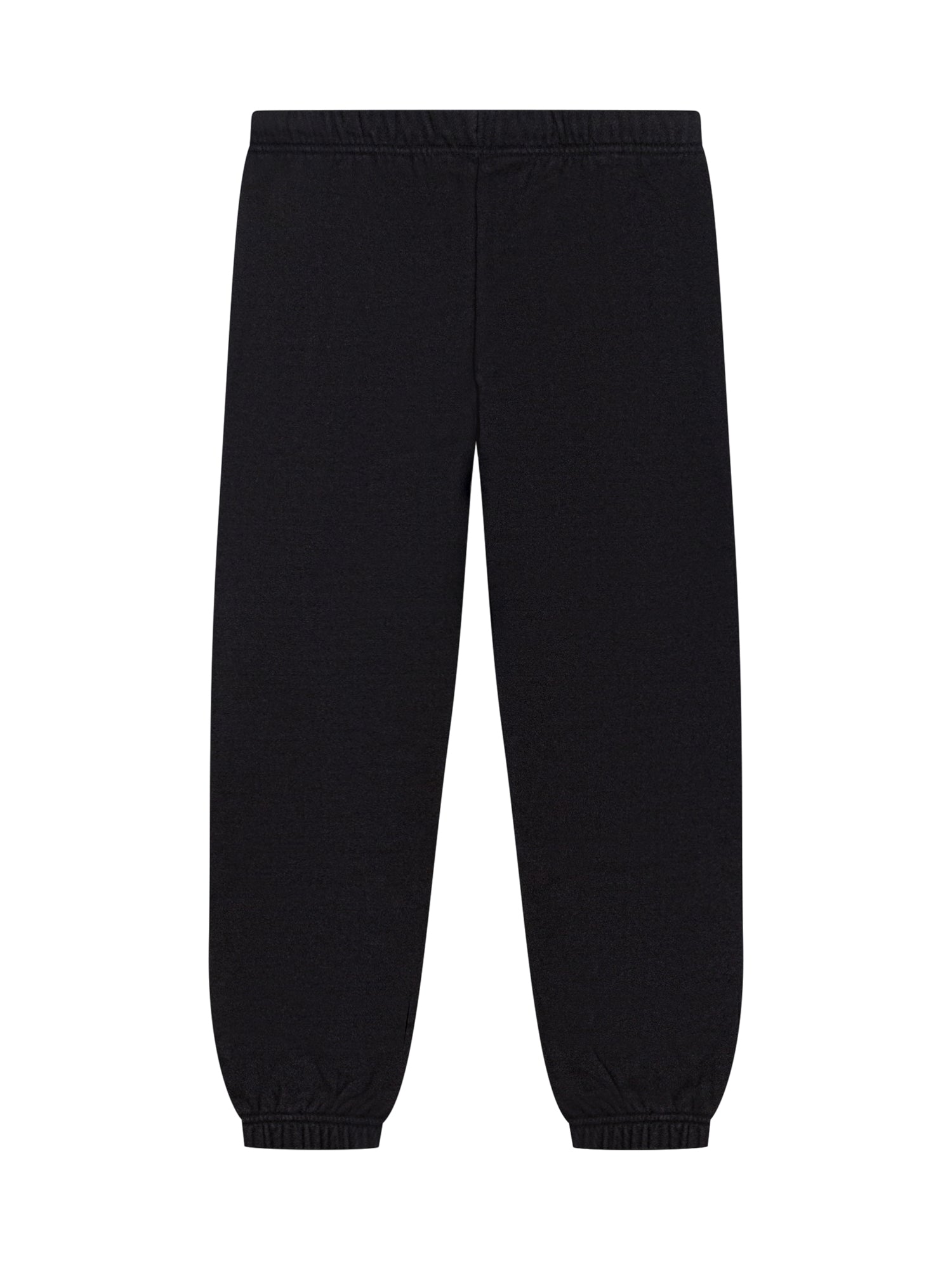 Black cotton Palm Angels pants with elastic waistband, drawstring, and oversized white logo printed on the leg.