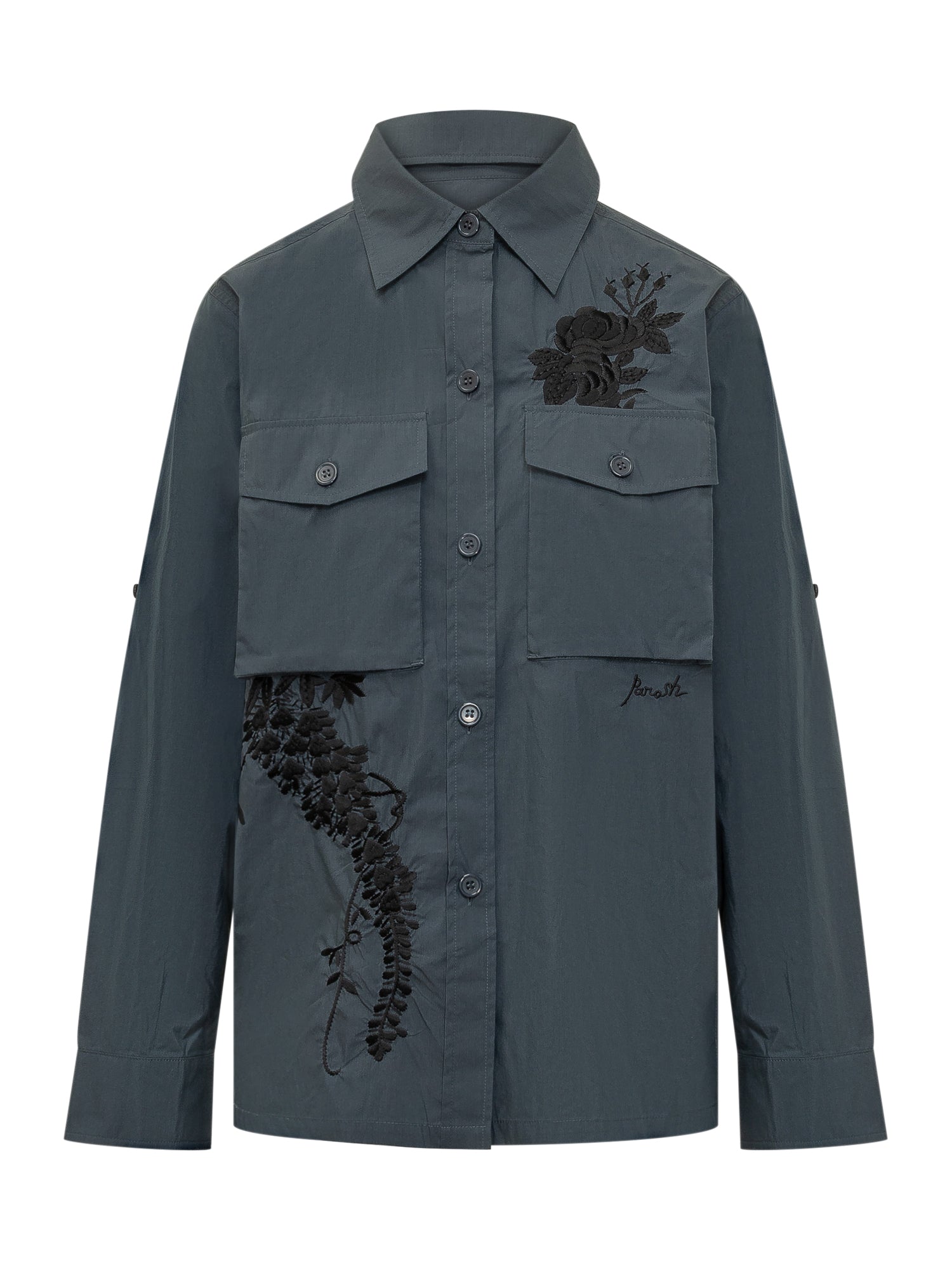 Womens shirt with classic collar, front button closure, long sleeves with cuffs, flap patch pockets, decorative floral embroidery.