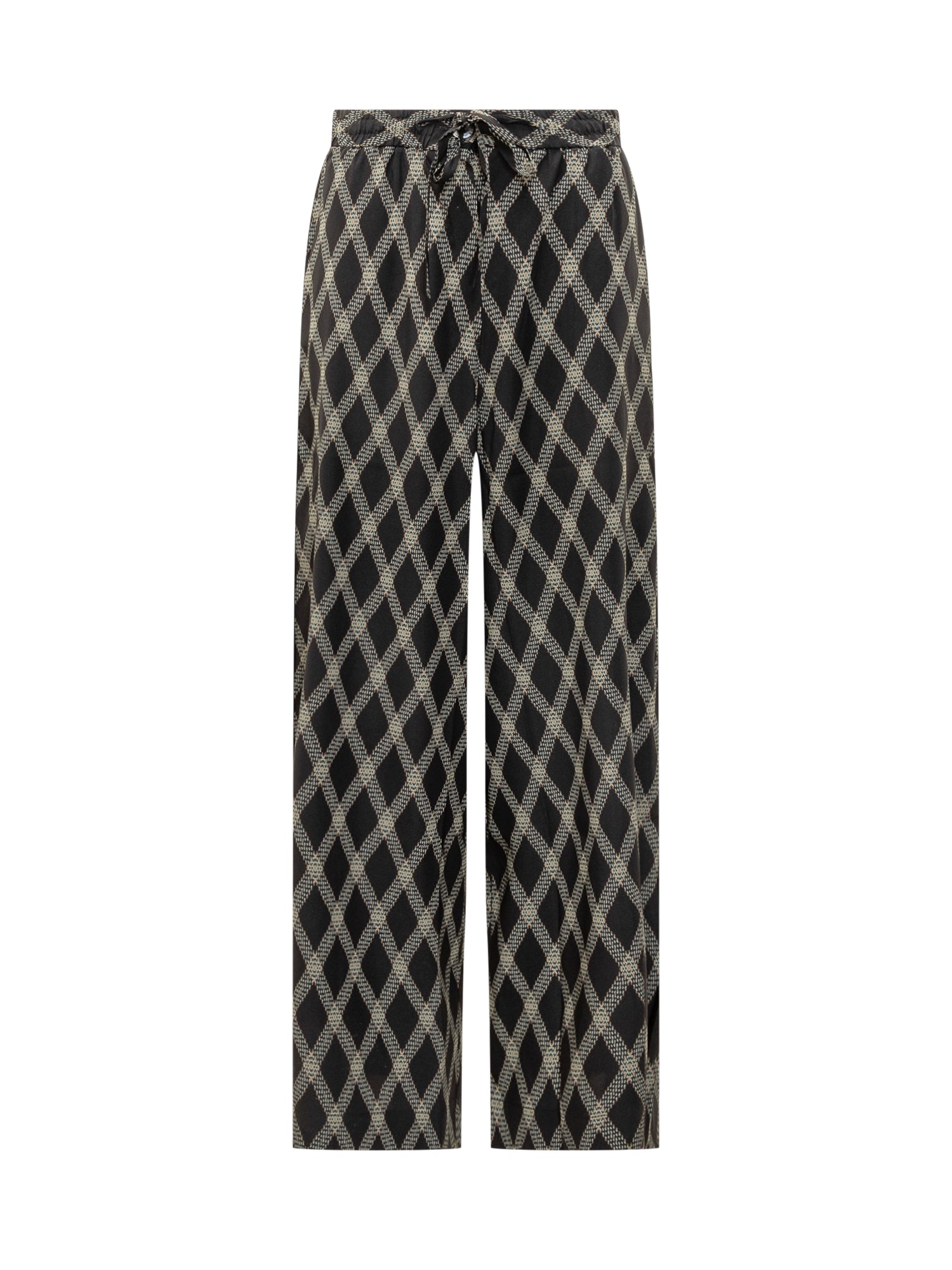 Wide-leg silk pants with diamond print and adjustable drawstring waist.