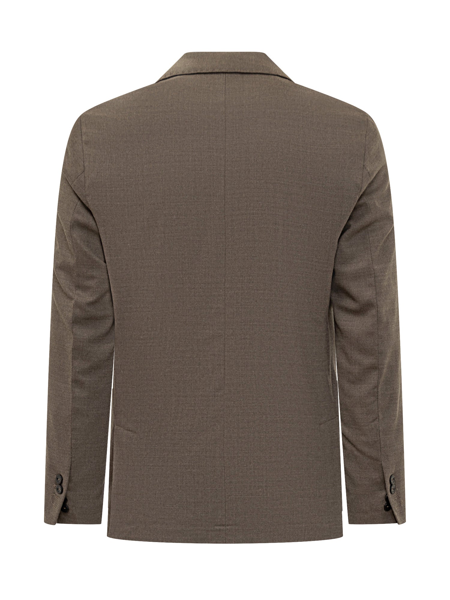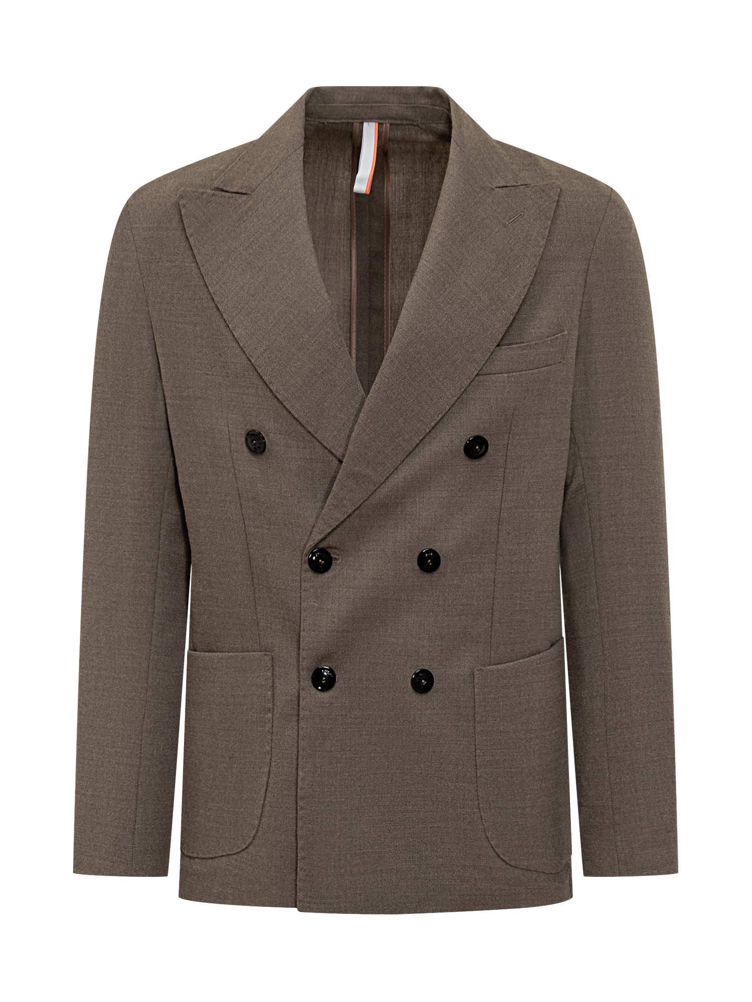 PMDS brown double-breasted blazer featuring wide lapels and patch pockets.