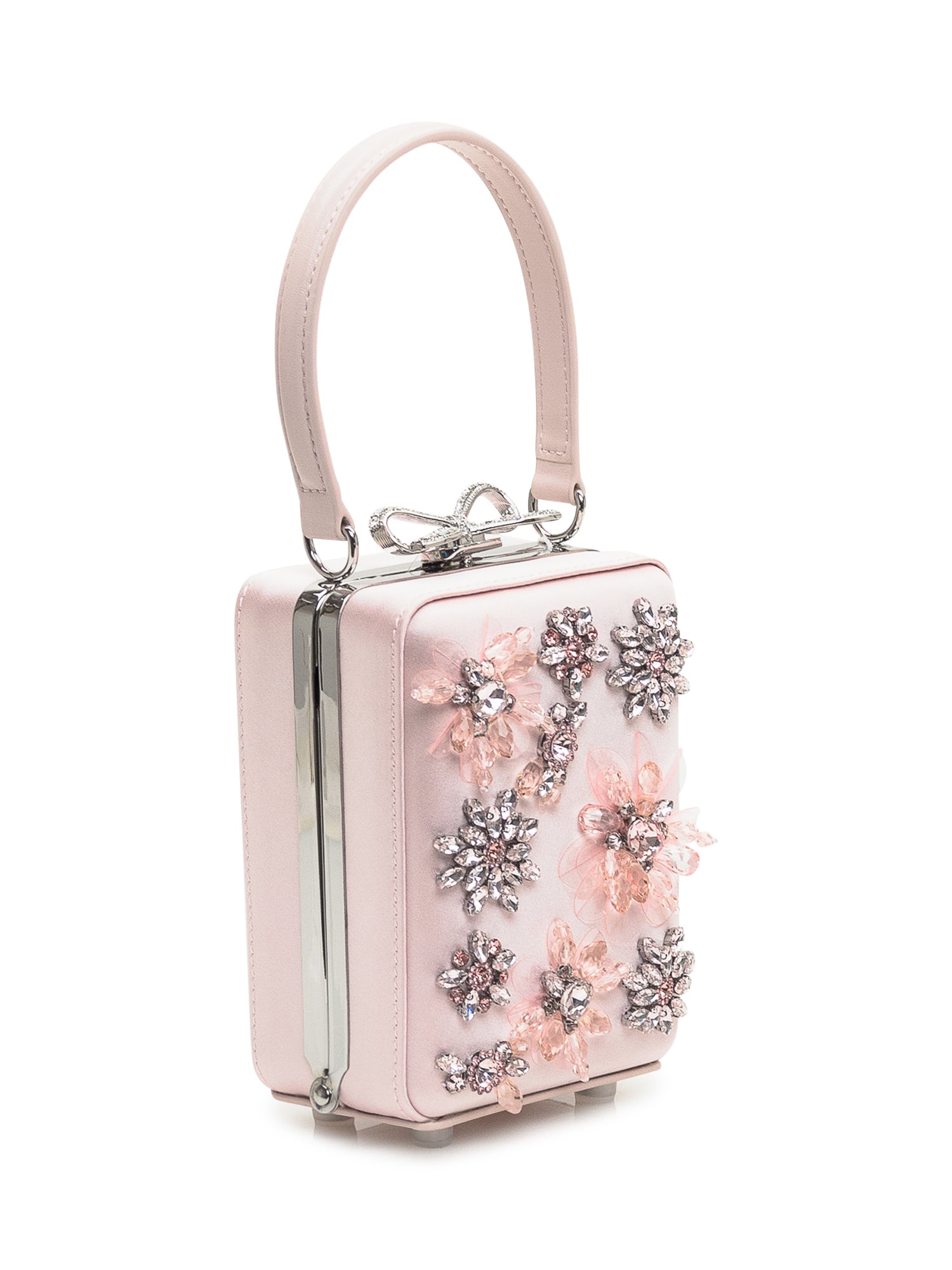 Elegant micro bag featuring jewel-like floral embellishments on a satin base. Designed with a structured handle and top closure, it adds a luminous touch to evening and special-occasion looks.