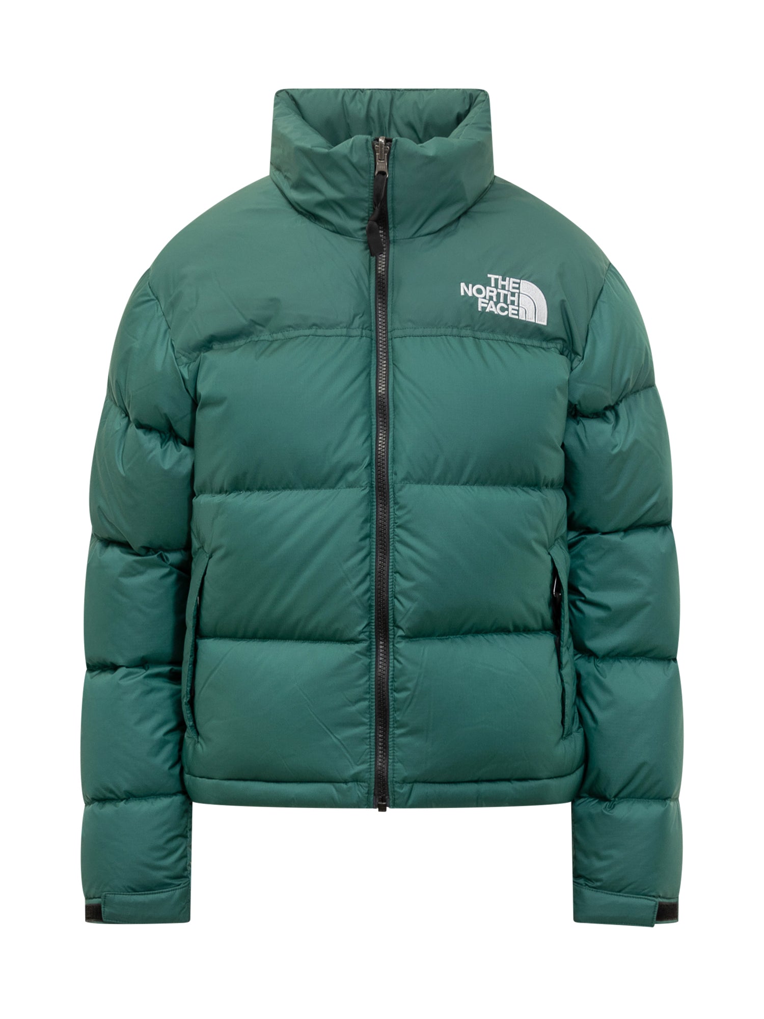 The North Face 1996 Retro Nuptse down jacket in green. Warm padded design with zip closure, embroidered logo, and a cropped silhouette for an iconic sporty look.