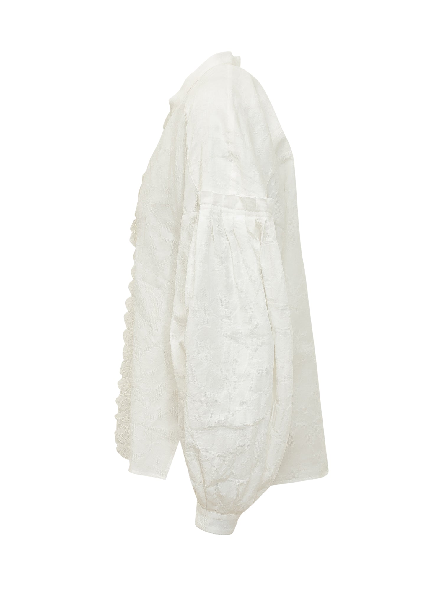 Lena long sleeve shirt with band collar and front button closure. Central lace insert and rounded hem. Buttoned cuffs and soft silhouette for a feminine look.