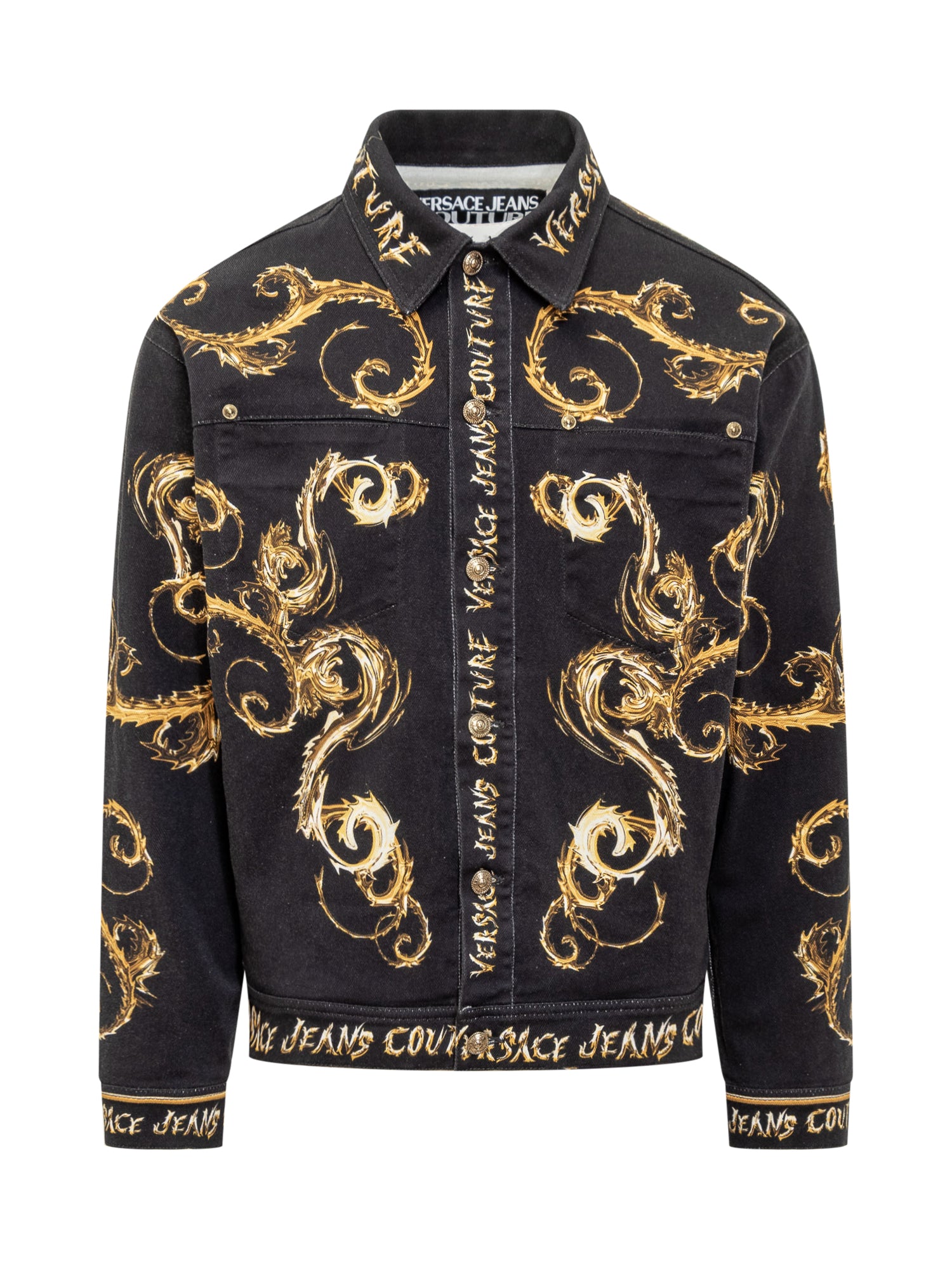 Denim jacket with classic collar. Button closure. Button cuffs. Two pockets on front. All-over logo motif.