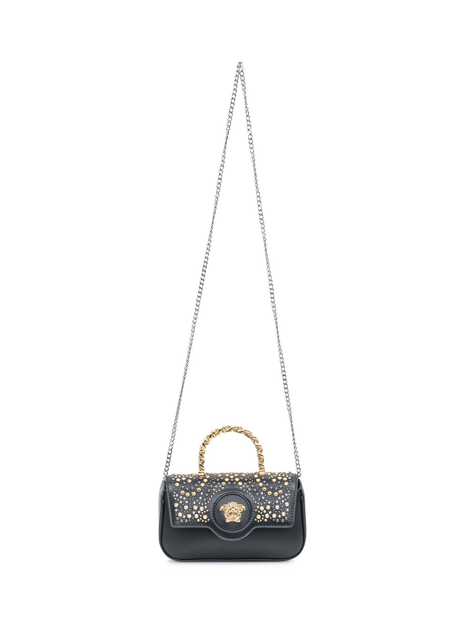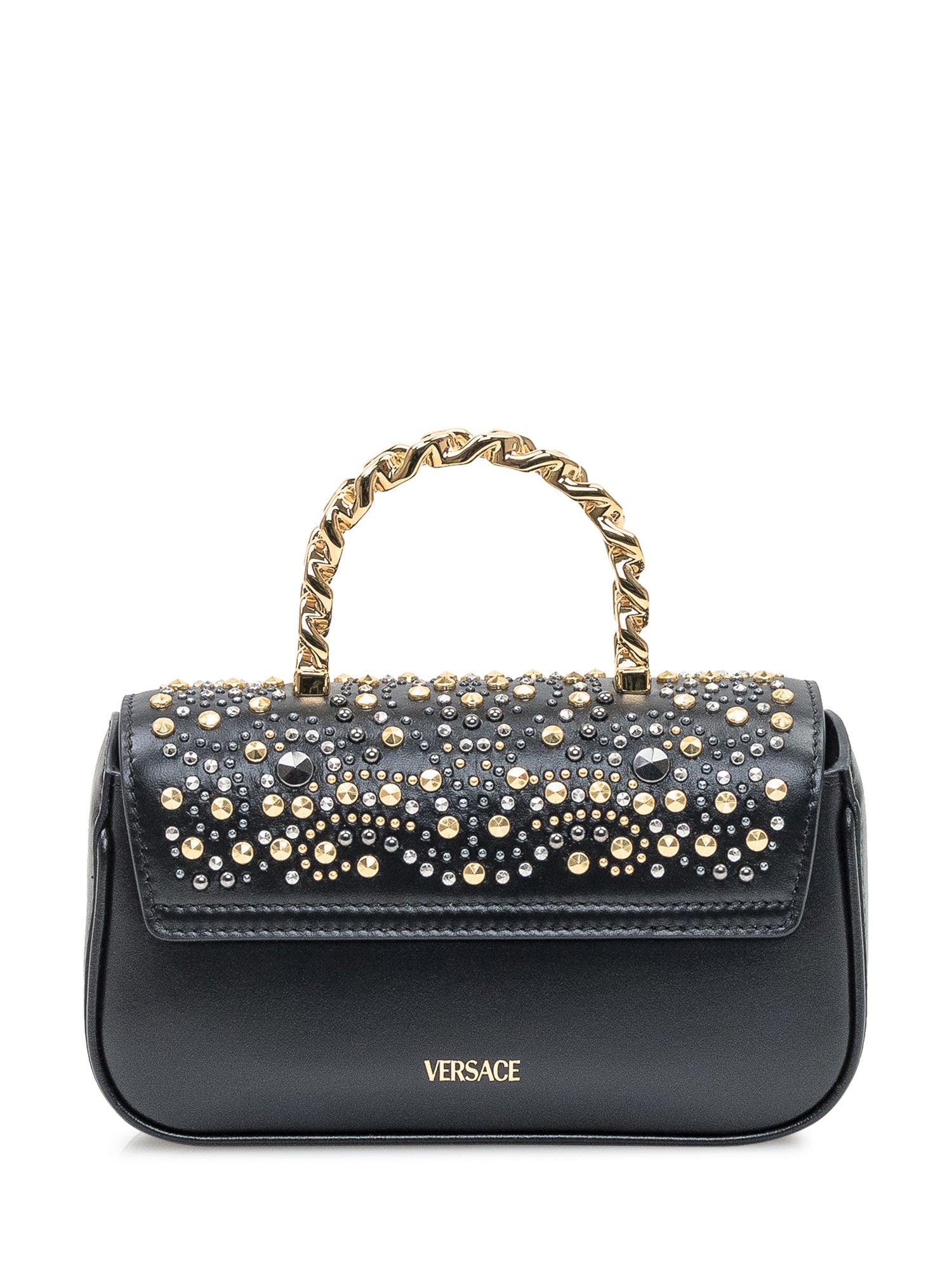 Versace Mini Top Handle bag in black leather with gold and silver studs, chain handle, and iconic Medusa detail.