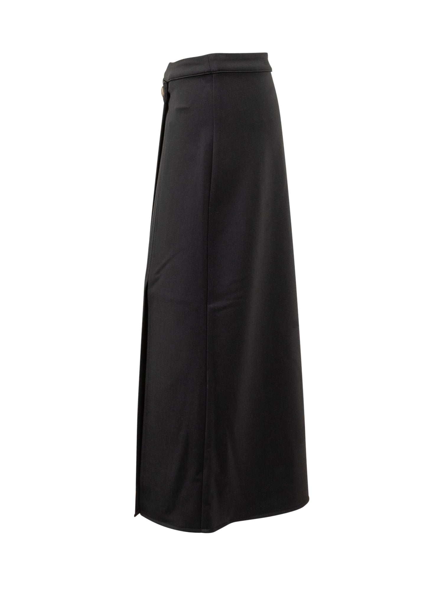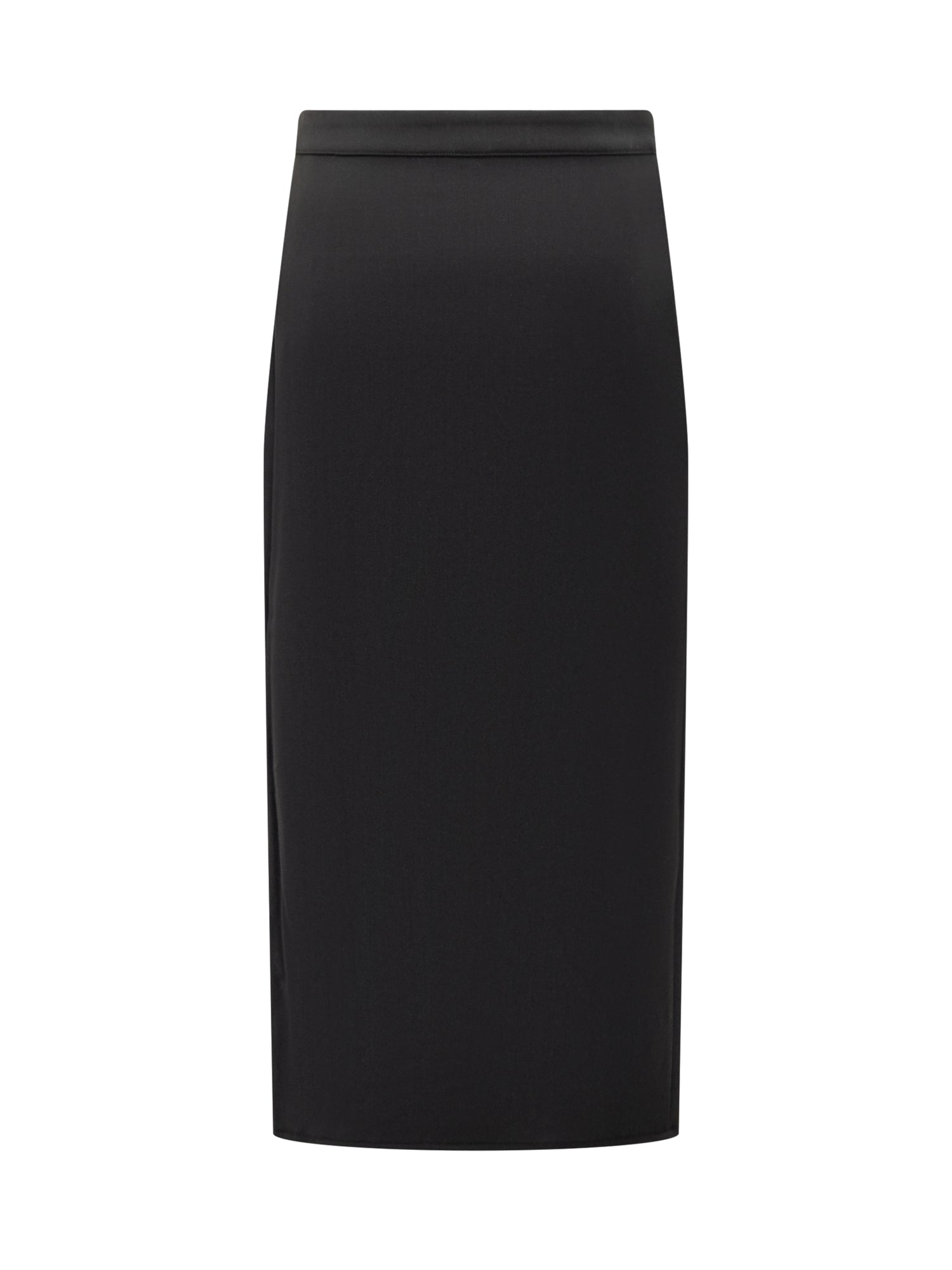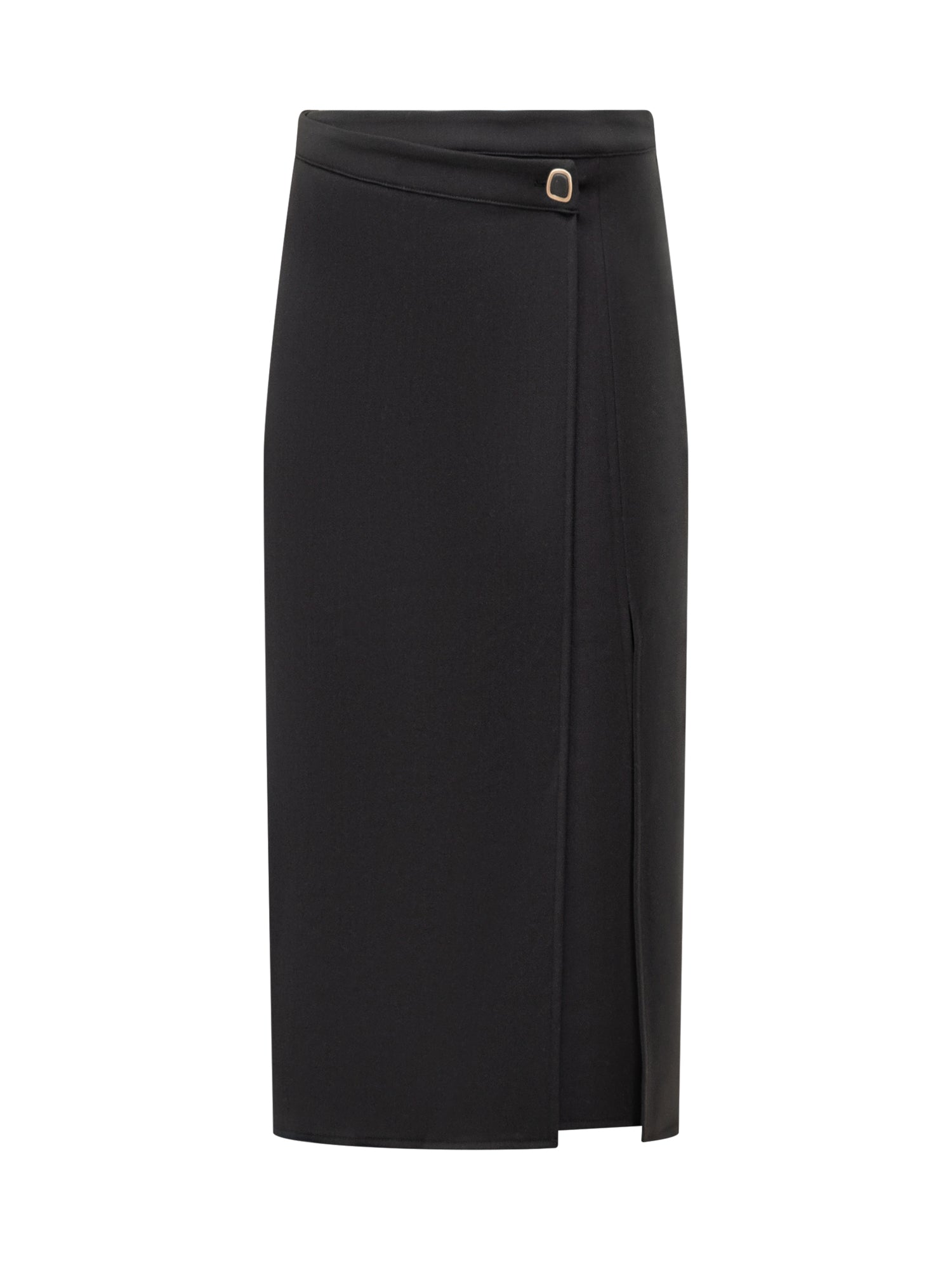Midi wrap skirt with a straight silhouette and metal waist detail. Elegant and versatile.