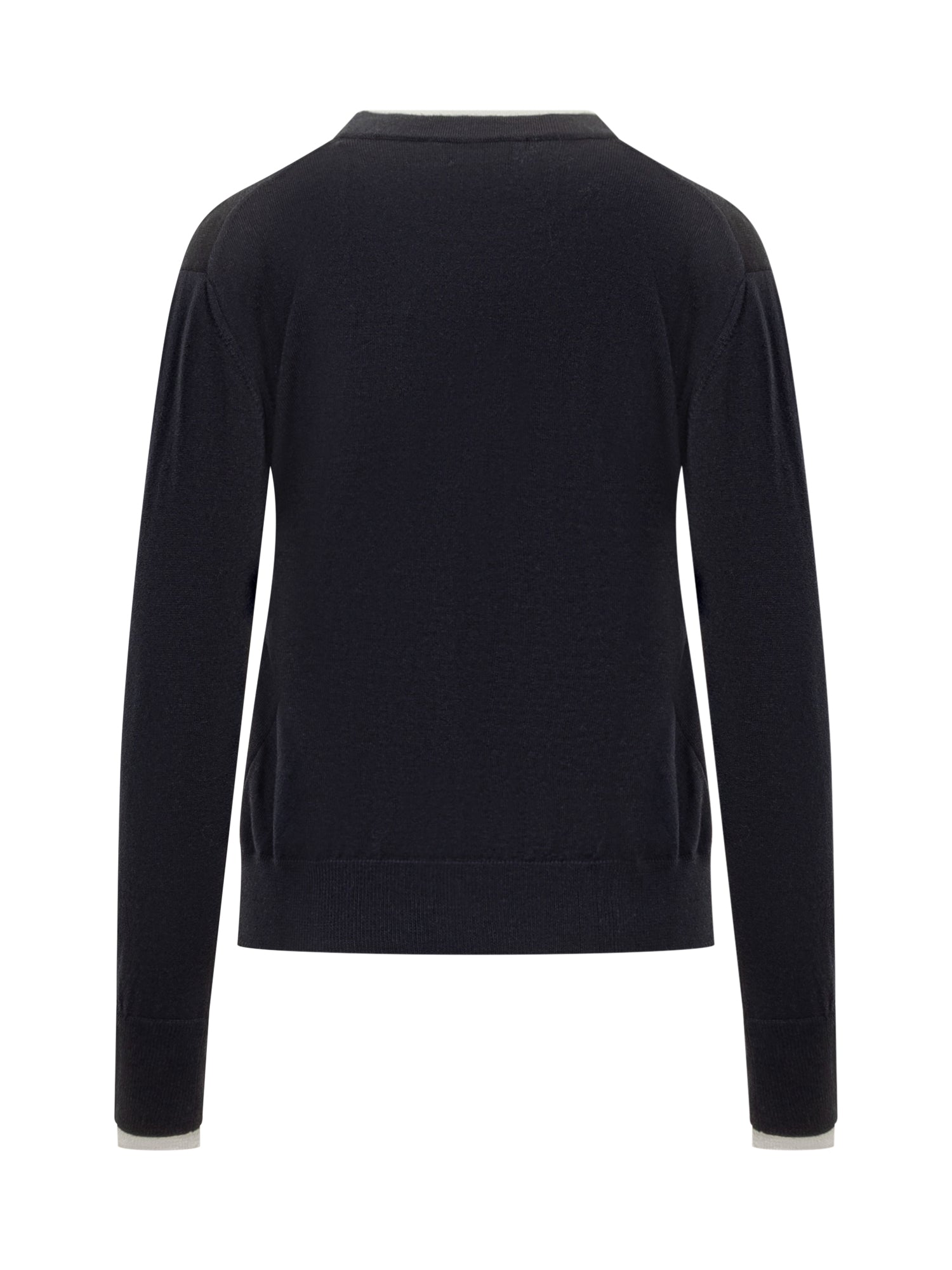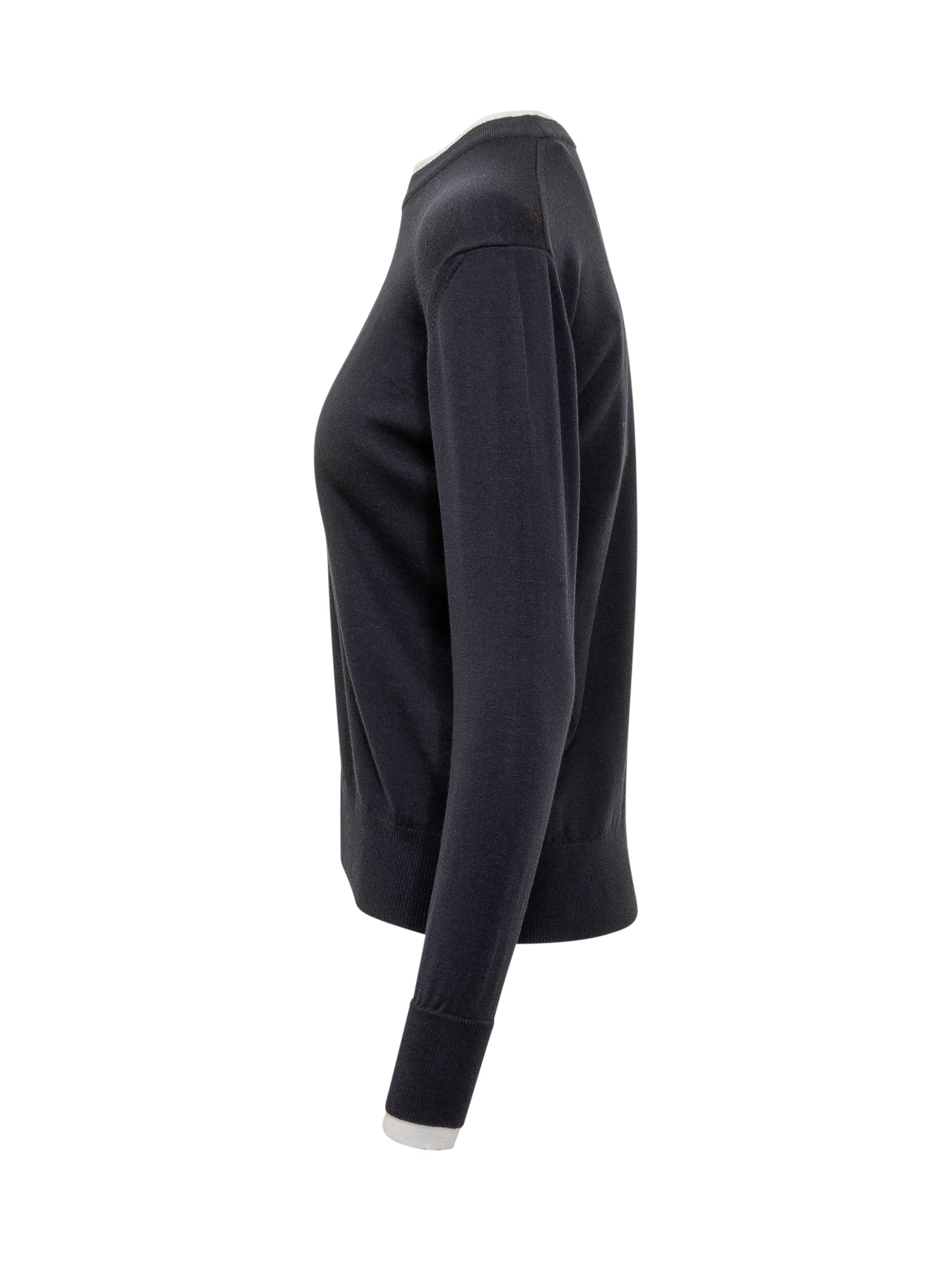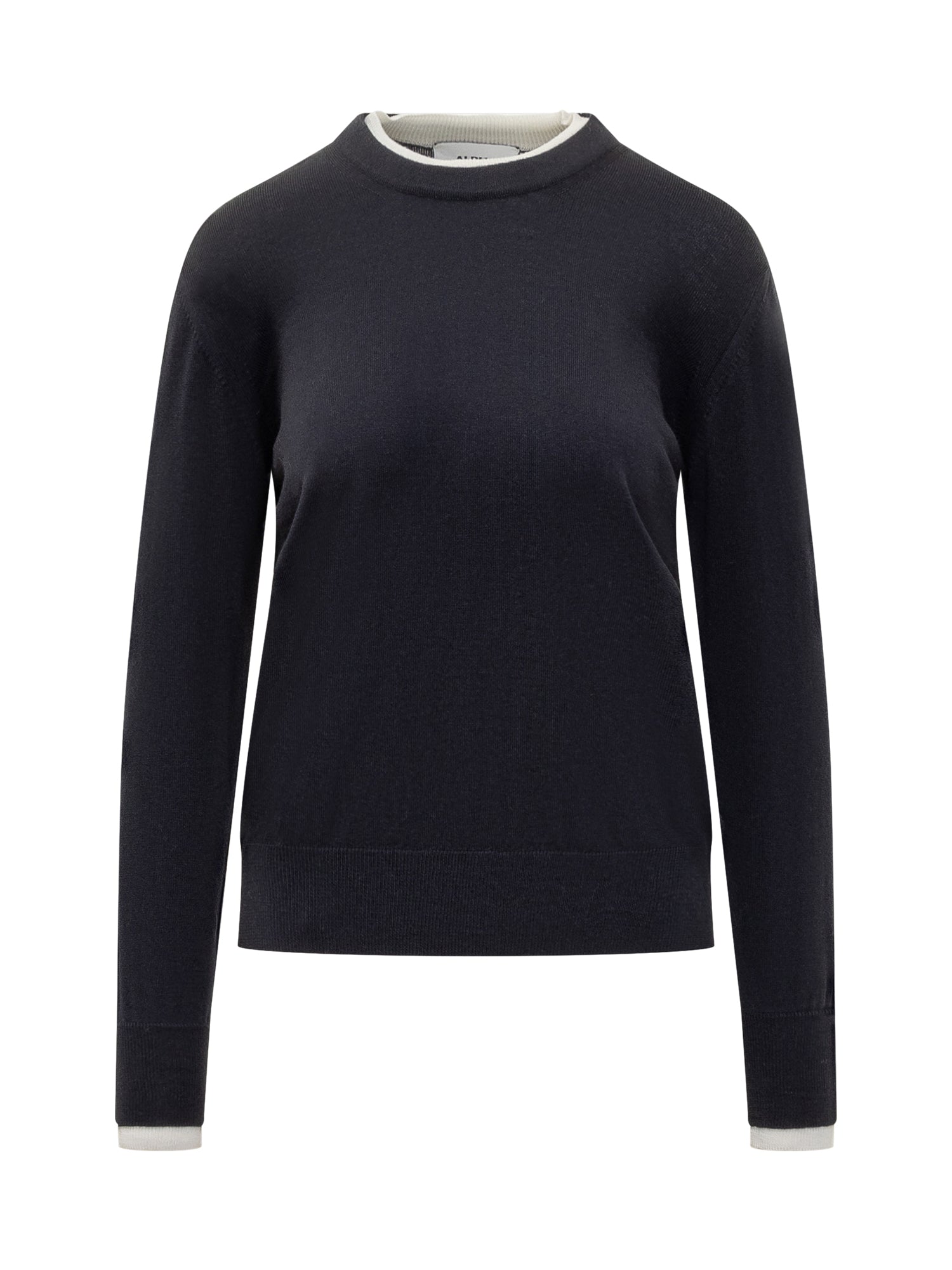Alpha Studio blue fine wool sweater featuring light contrast neck and cuffs. Essential design and regular fit for a refined minimal style.