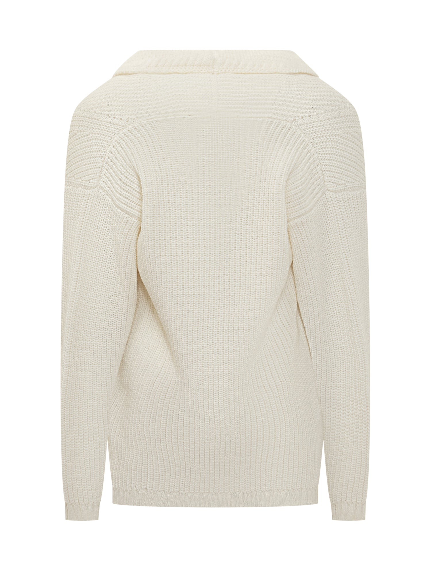 Amaranto white wool cardigan with cable knit design and dark buttons.
