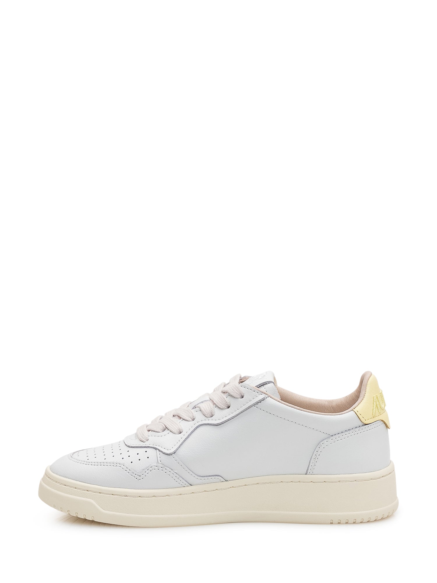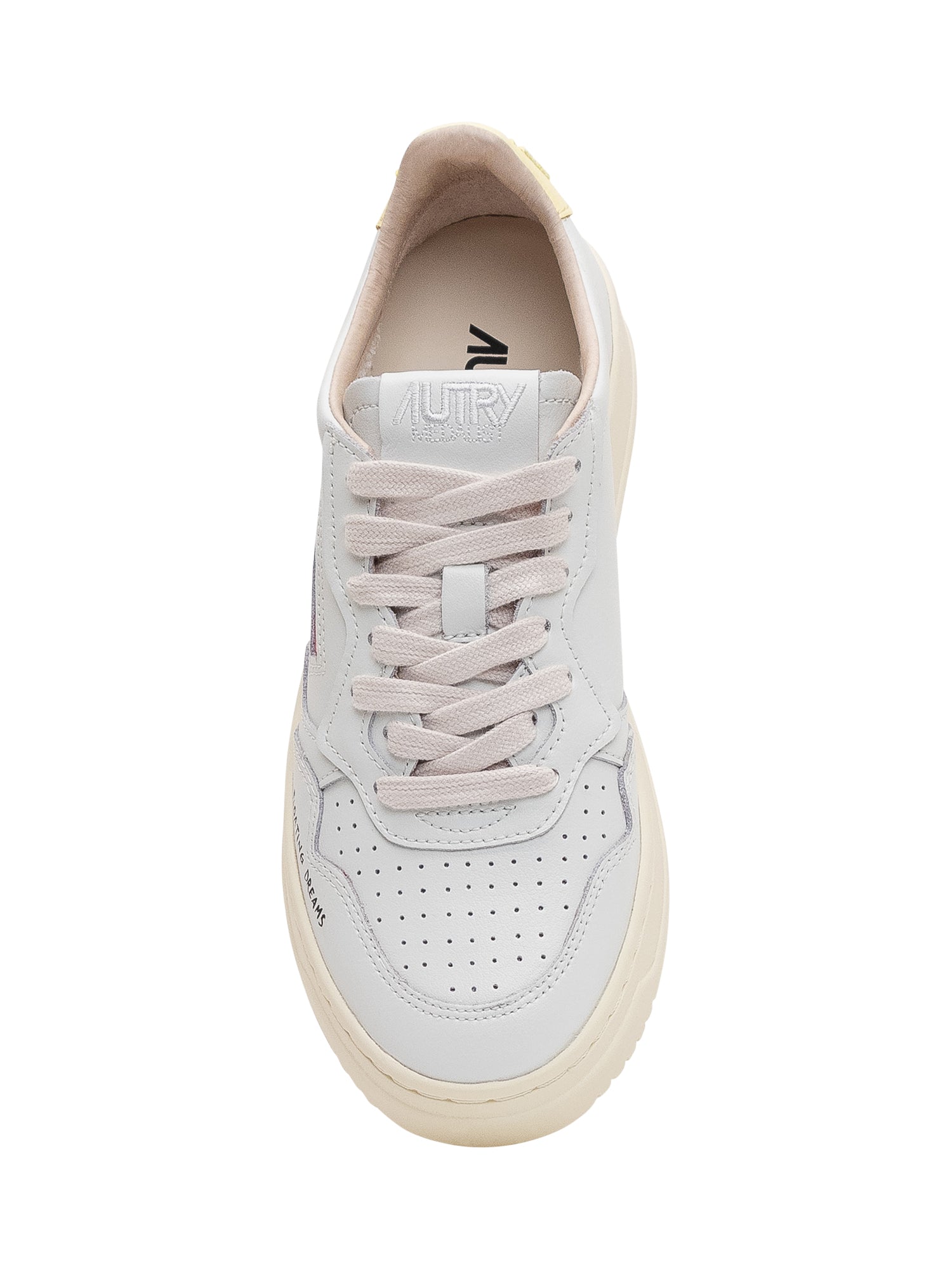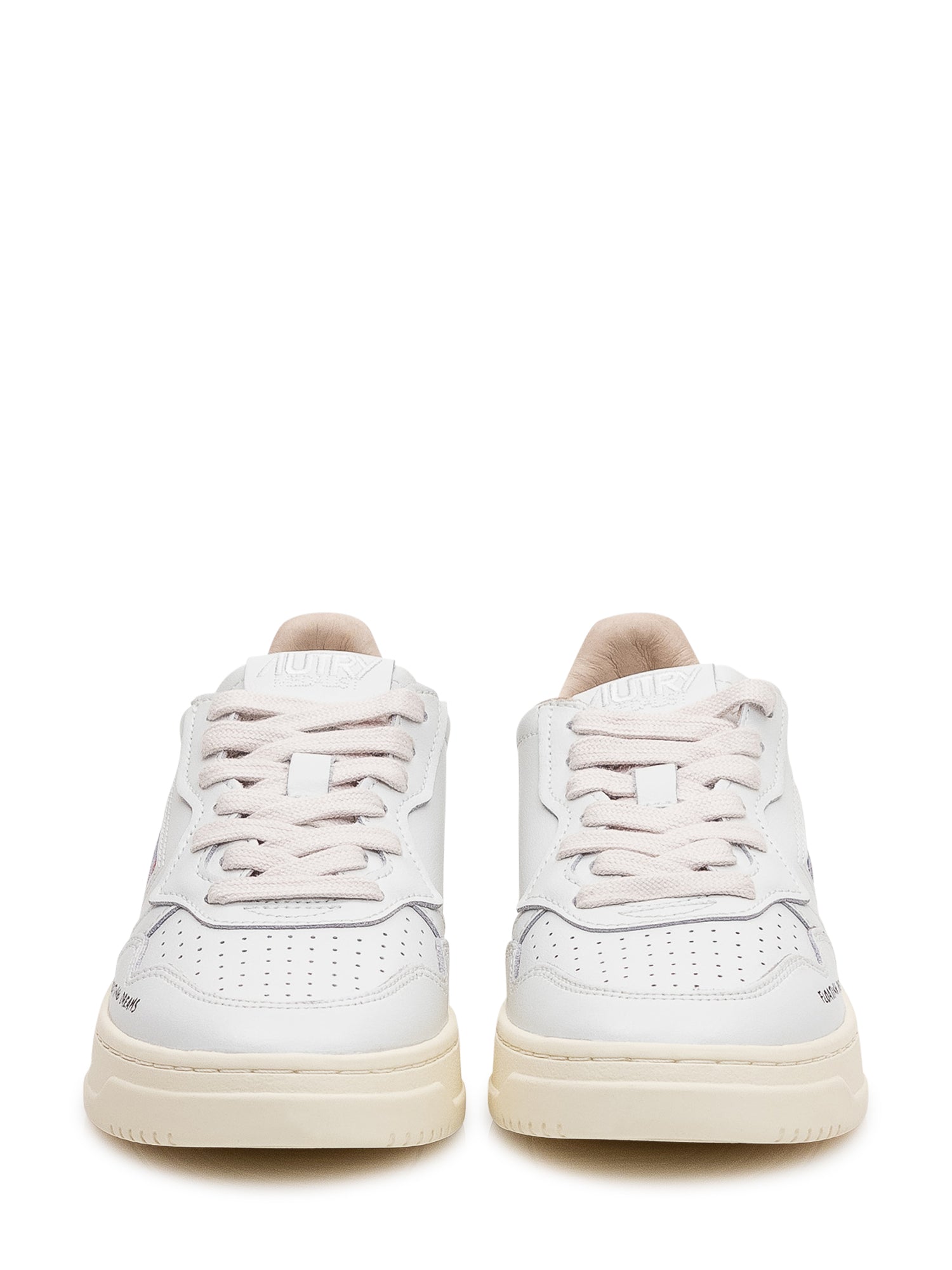 Leather sneakers featuring flat sole and perforated toe. Side lettering details and contrast heel tab add a signature finish.