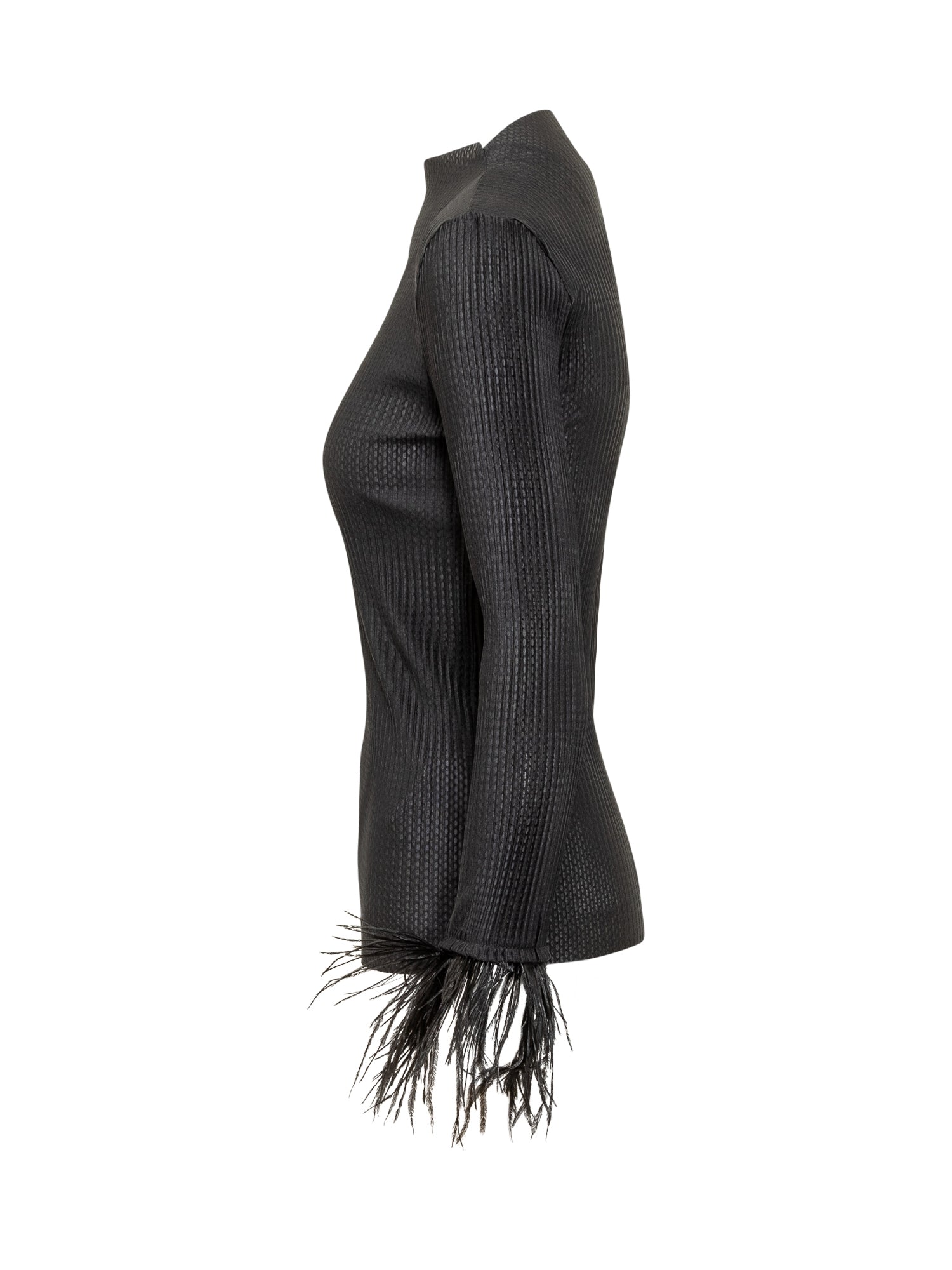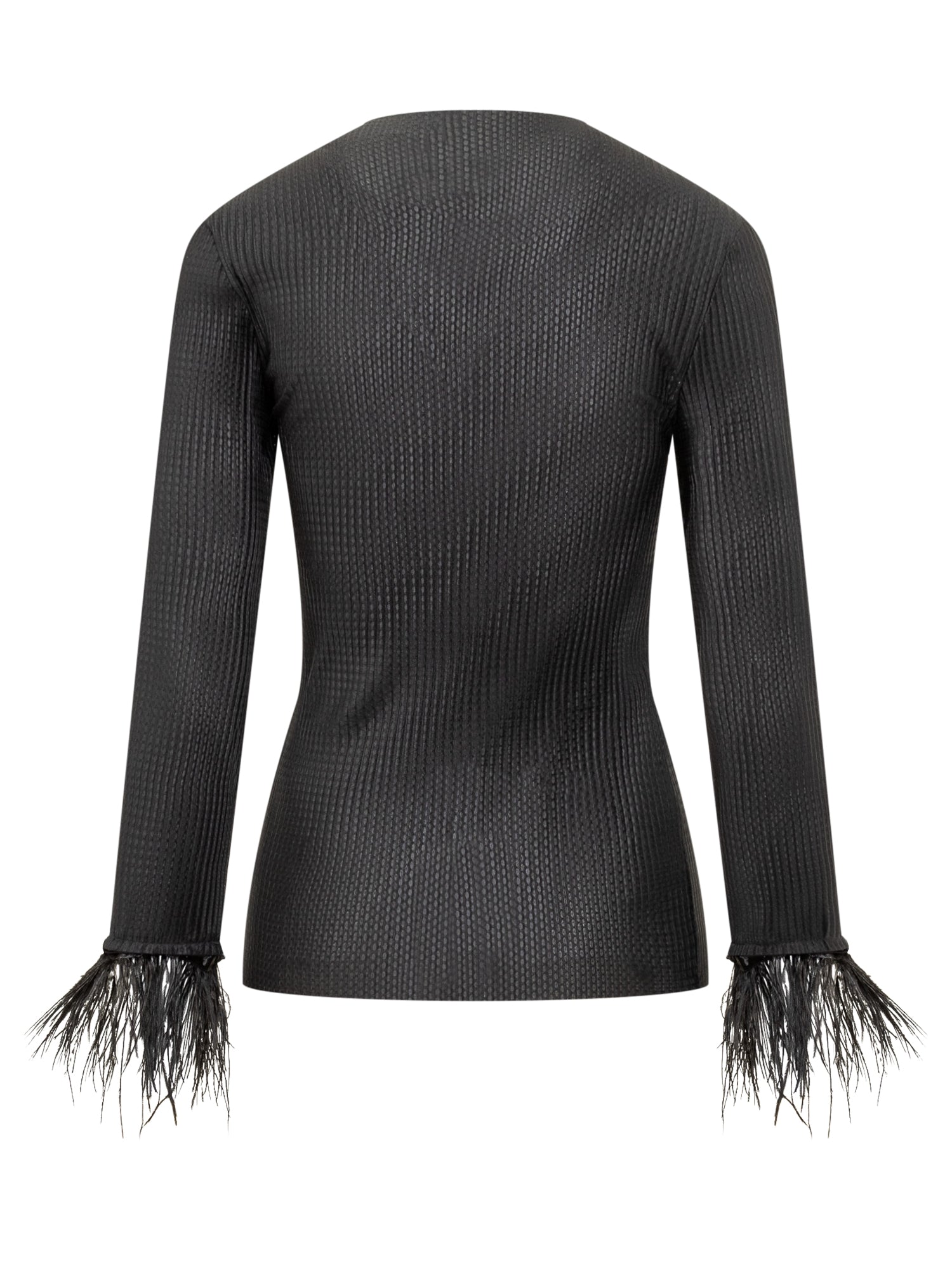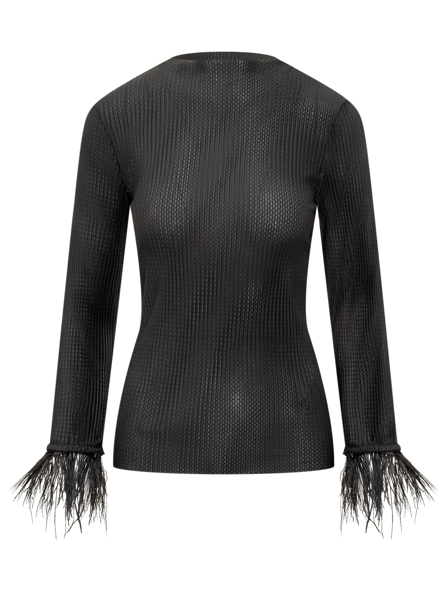 Boss shiny-effect jersey top featuring feather details at the cuffs. With a sleek, modern fit, it adds a sophisticated and glamorous touch to evening or special occasion looks.