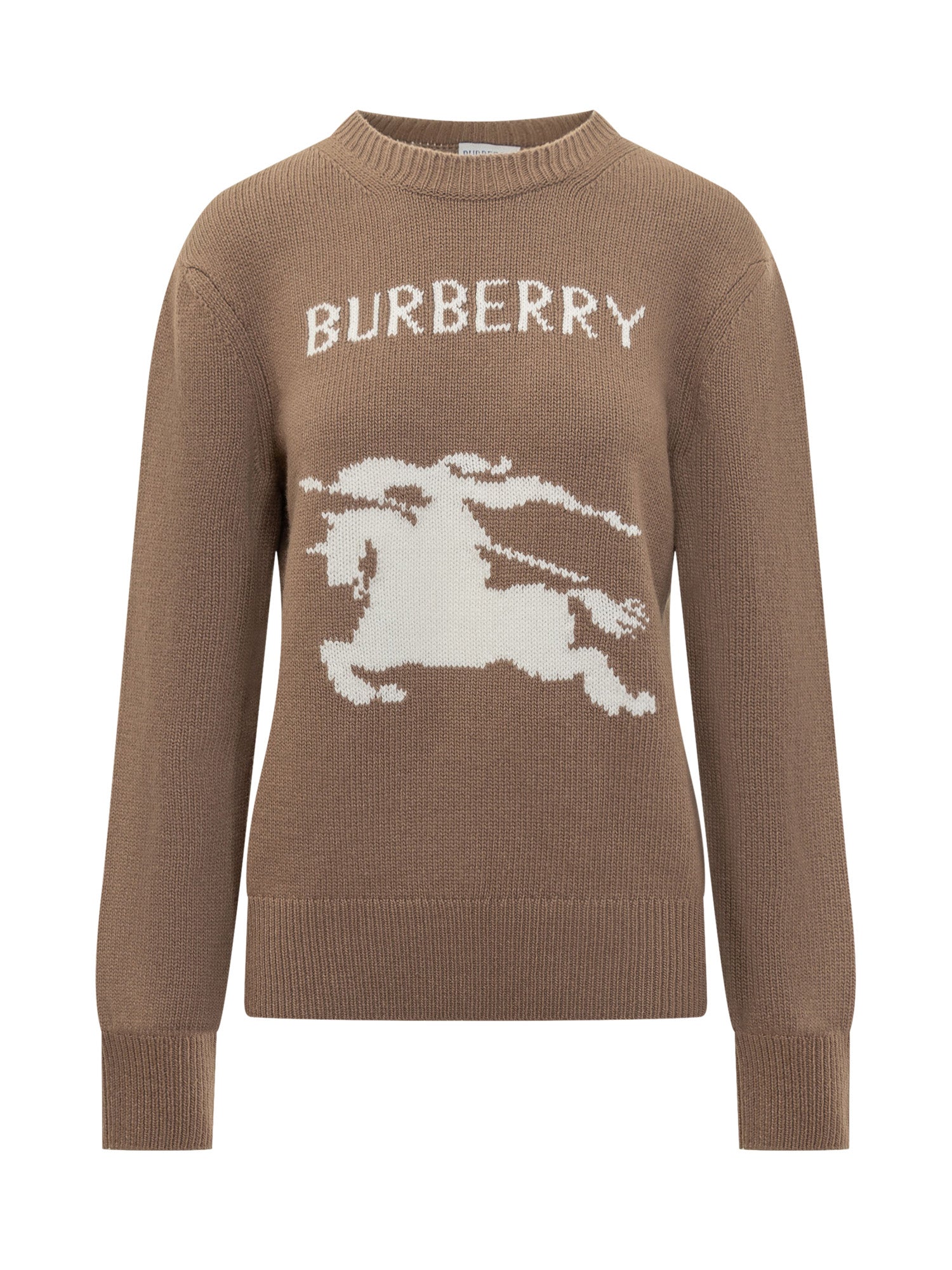 Burberry wool sweater in brown with contrasting knight logo. Soft and warm, this timeless piece embodies classic British elegance.