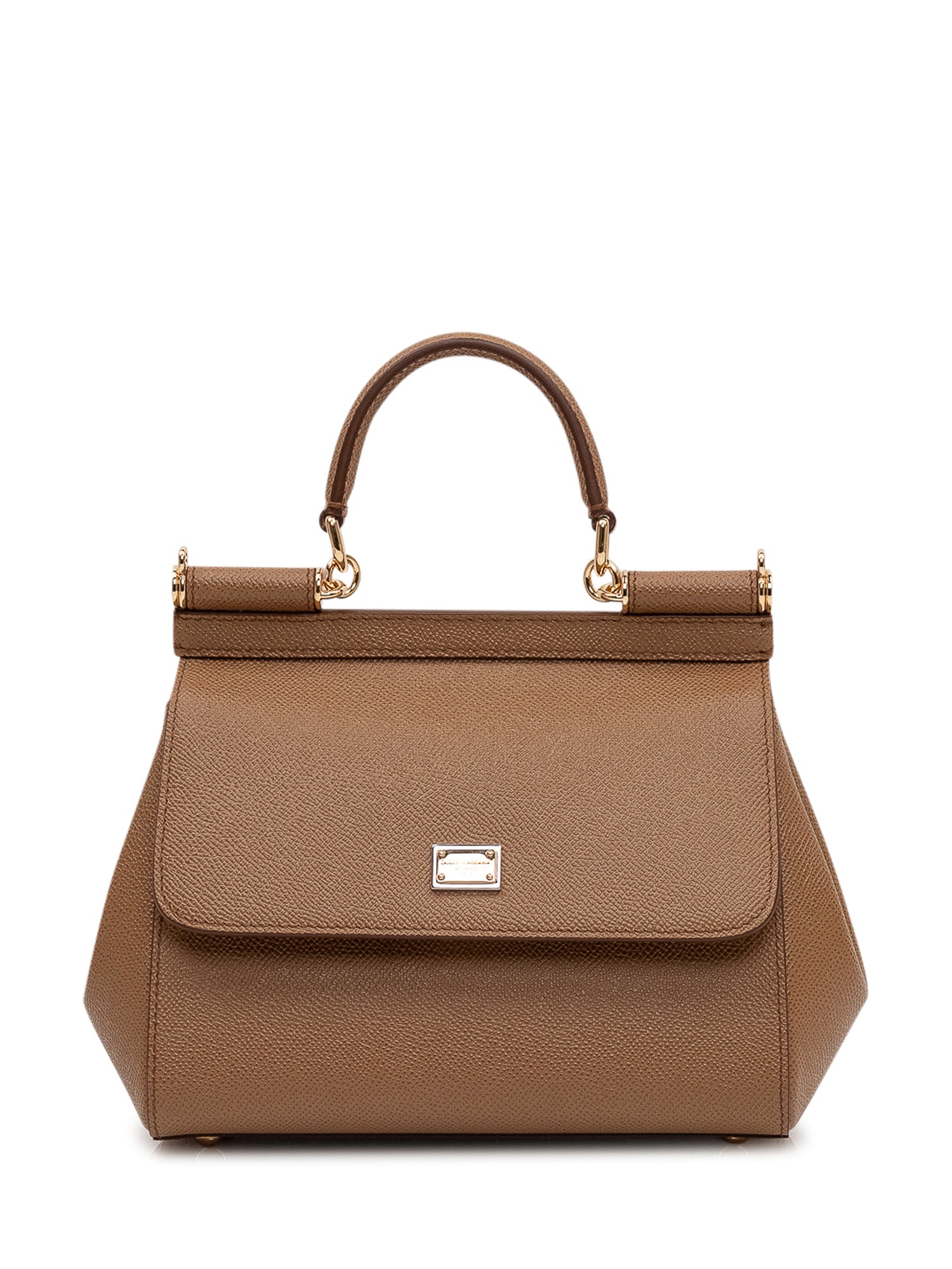 Structured handbag with front flap and concealed closure, single top handle and applied metal logo detail. Trapeze silhouette with protective bottom studs and textured finish.