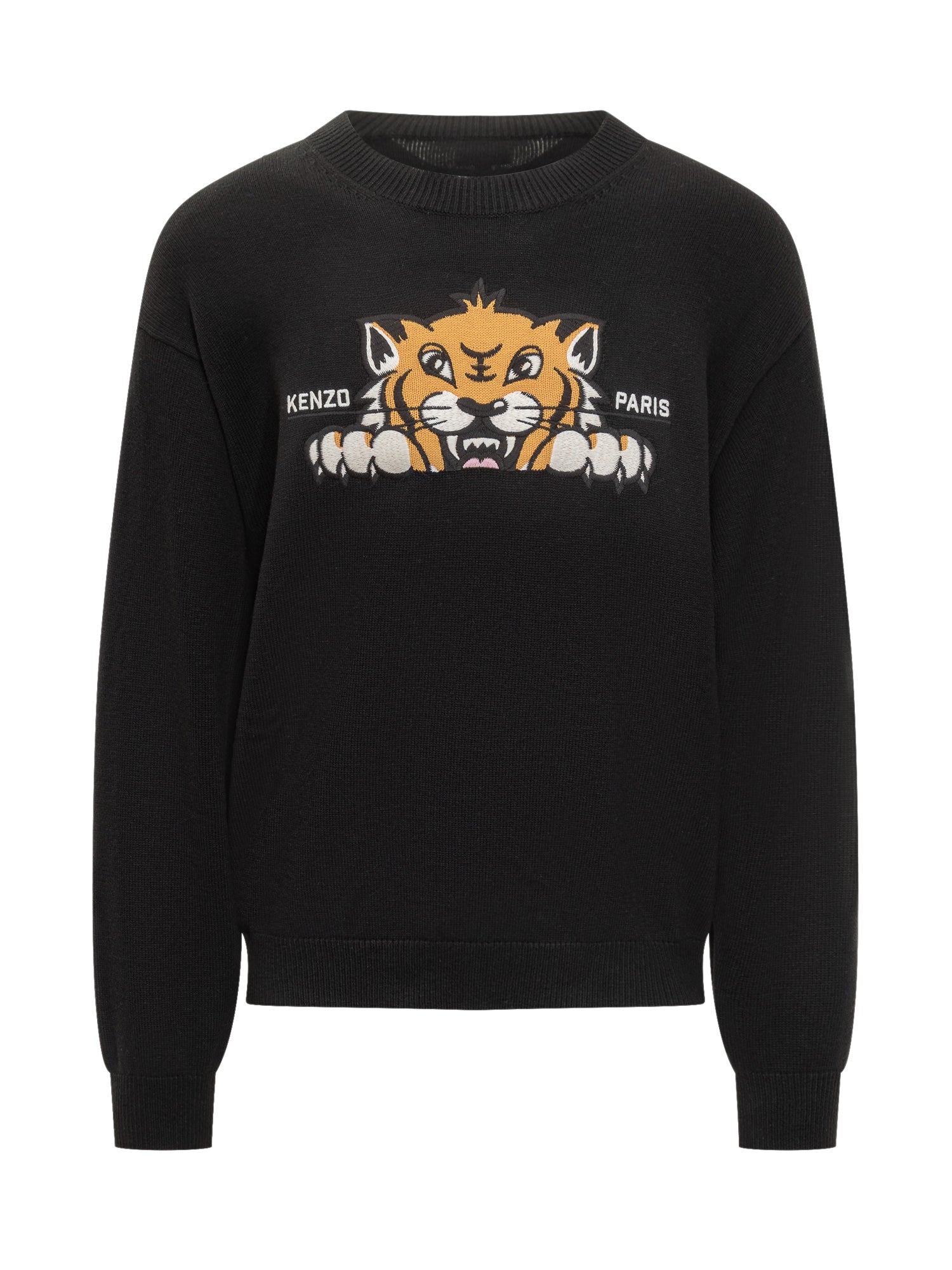 Kenzo black wool sweater featuring iconic tiger motif and Kenzo Paris lettering.