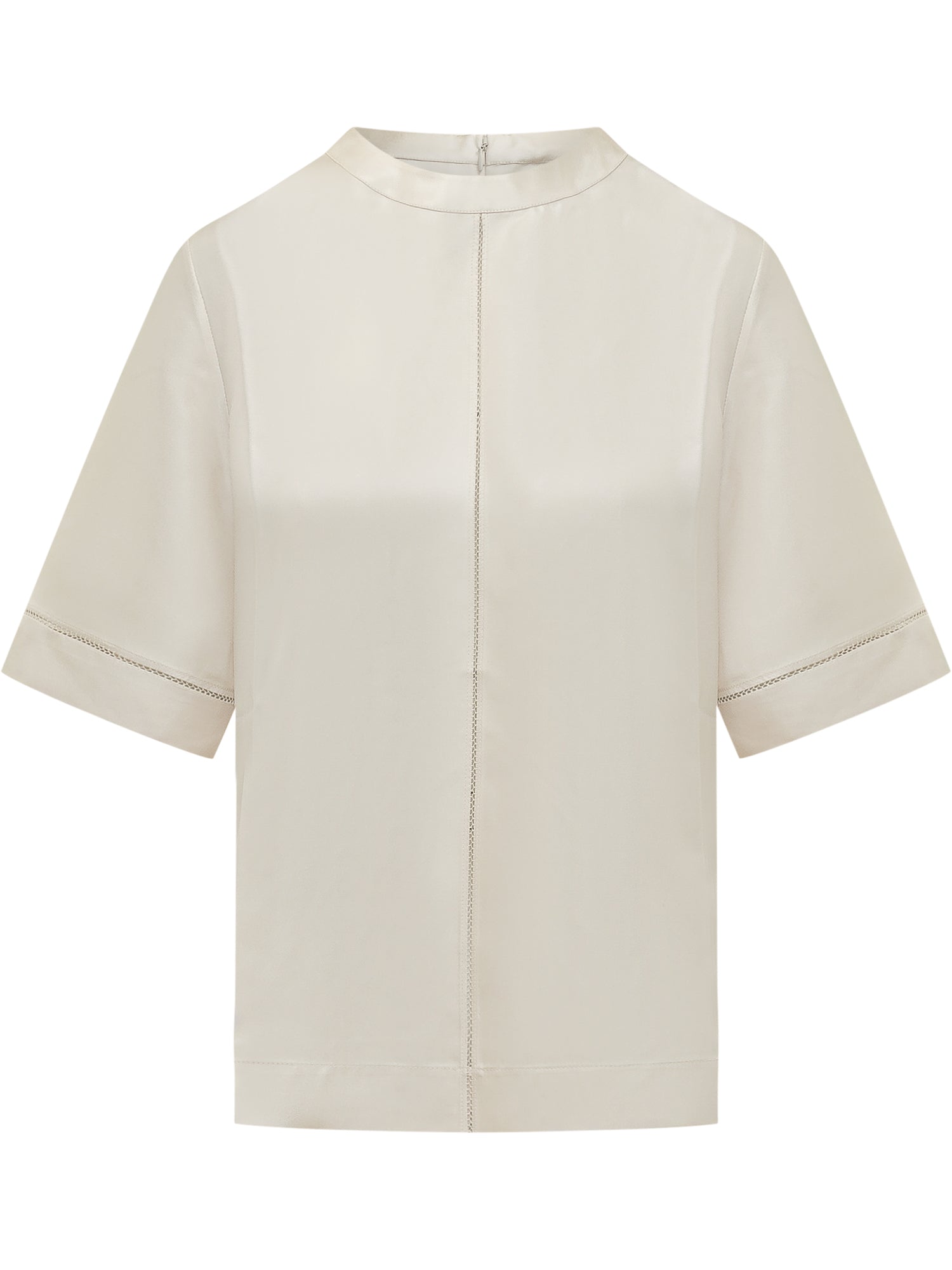 Short sleeve T-shirt with high neck and back zip closure. Lace details on sleeves and central front seam. Straight cut and refined design, ideal for elegant and contemporary looks.