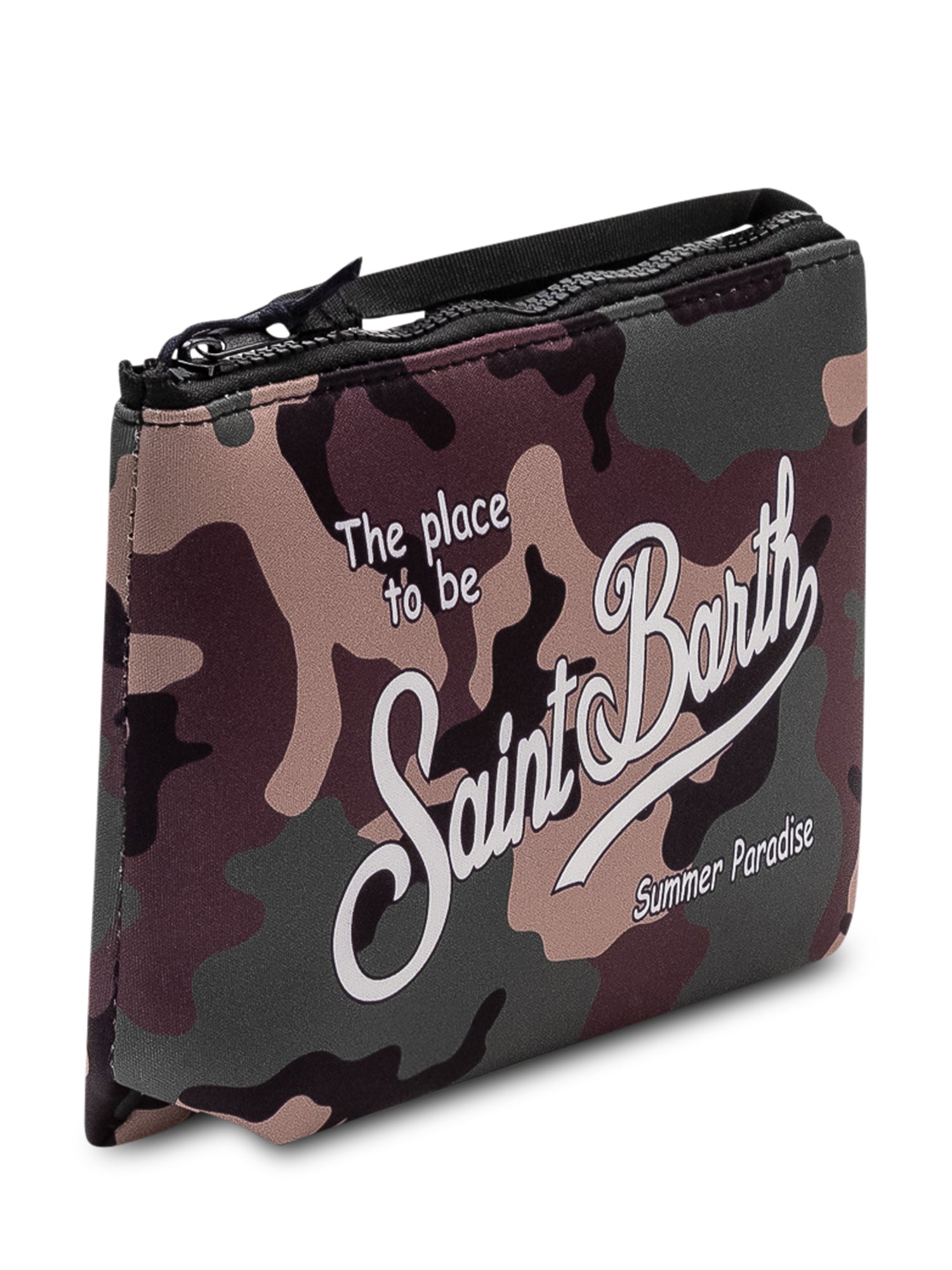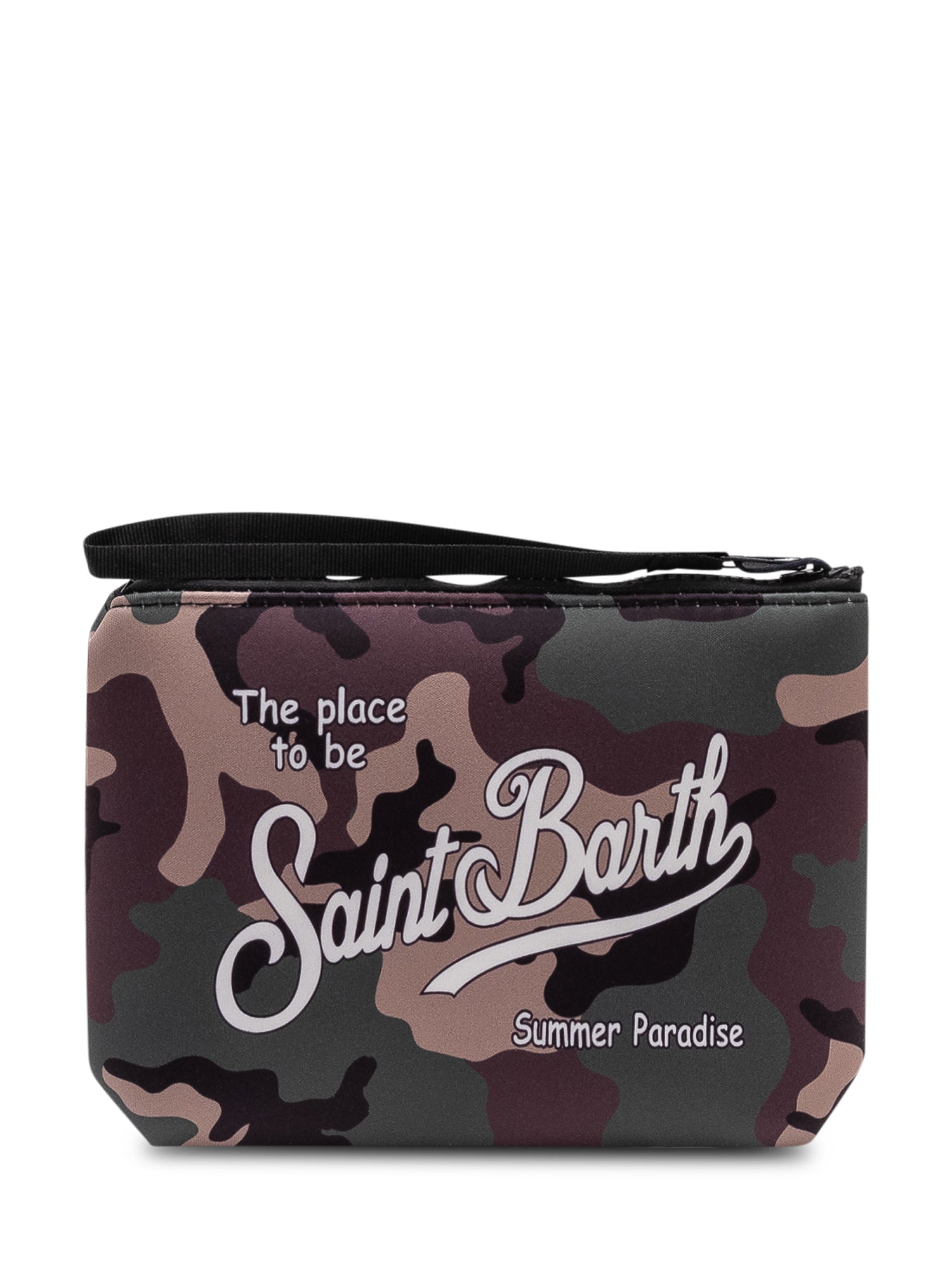 Aline pouch with soft structure and top zip closure. Front printed logo and side wrist strap for hand carry.