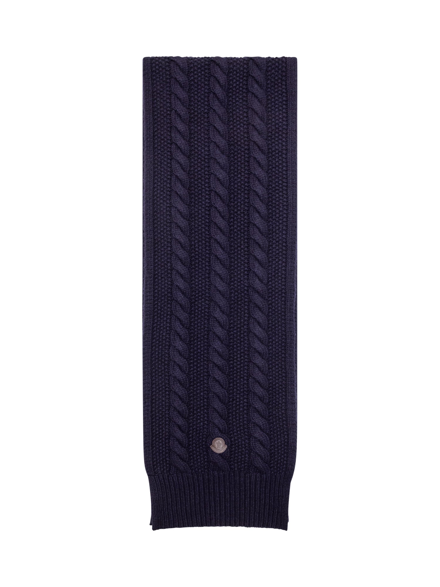 Blue wool scarf. Knitting. Ribbed hem. Logo applied.
