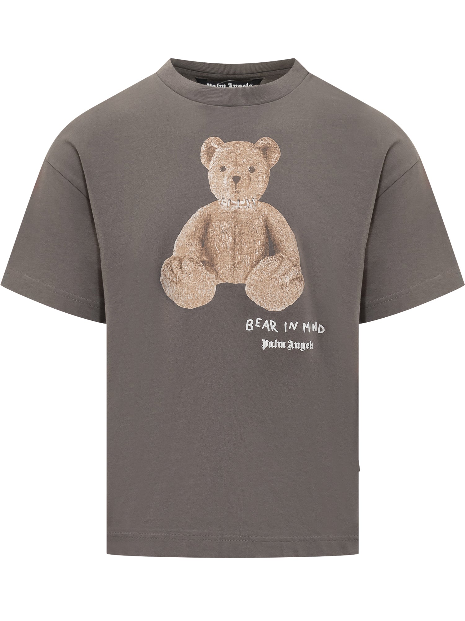 Palm Angels grey cotton T-shirt featuring front teddy bear print and Bear In Mind lettering.