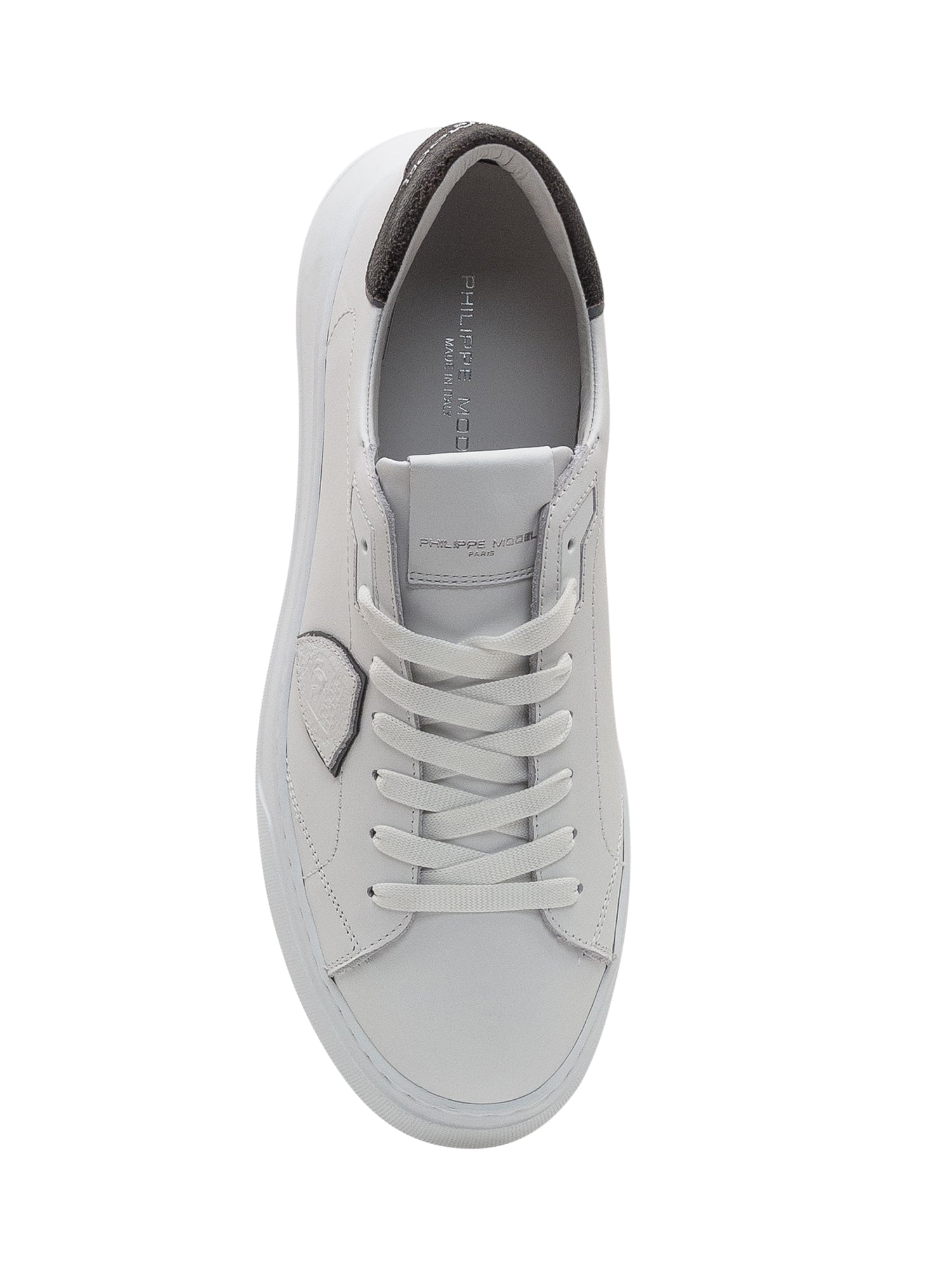 Philippe Model sneakers in white leather with a black cracked leather detail on the heel. Stitched shield logo on the side and thick white sole.