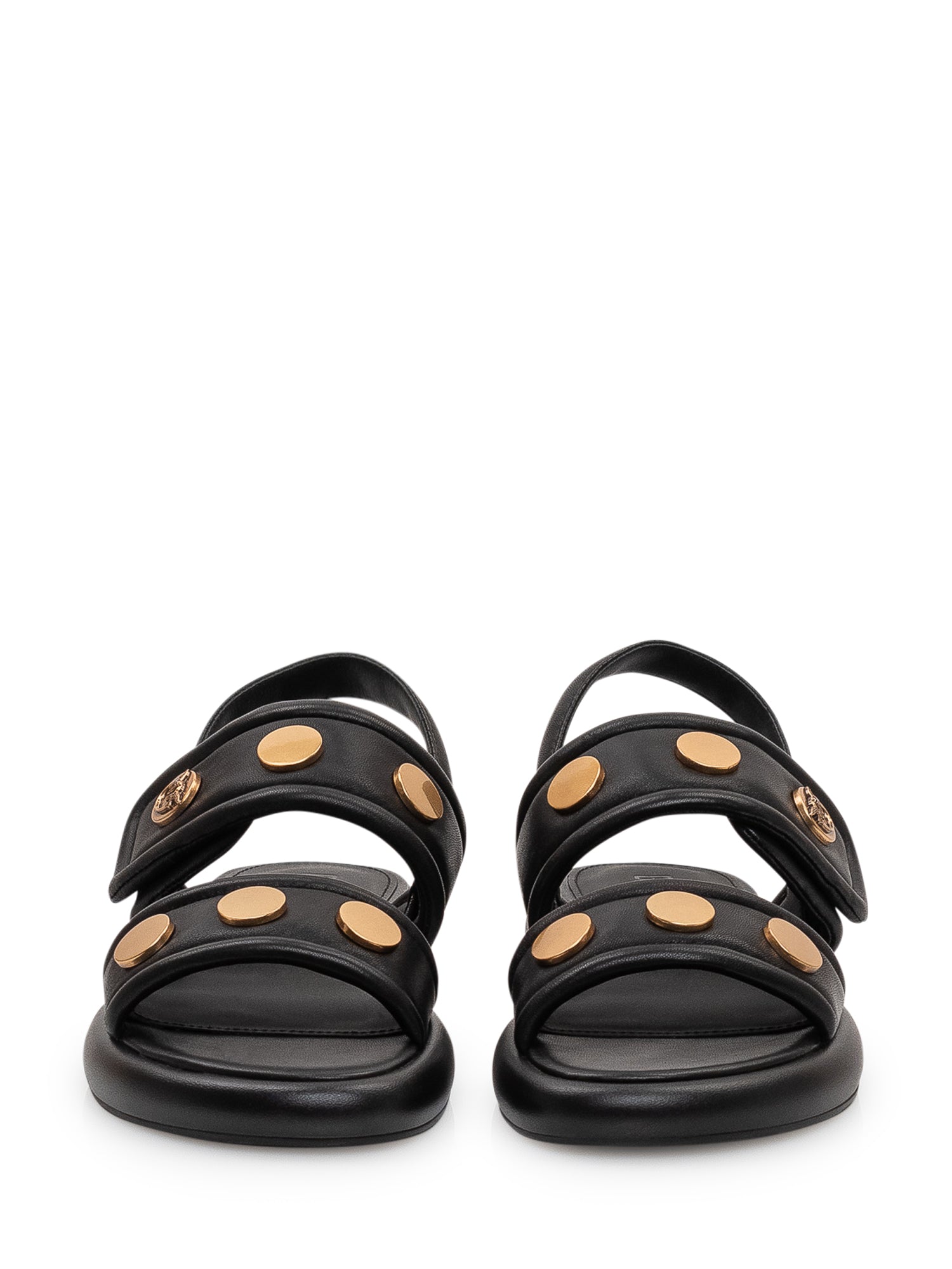 Flat leather sandals featuring double padded straps and a back strap. Embellished with decorative metal appliqués on the straps and a contoured sole for optimal comfort, perfect for a bold and contemporary look.