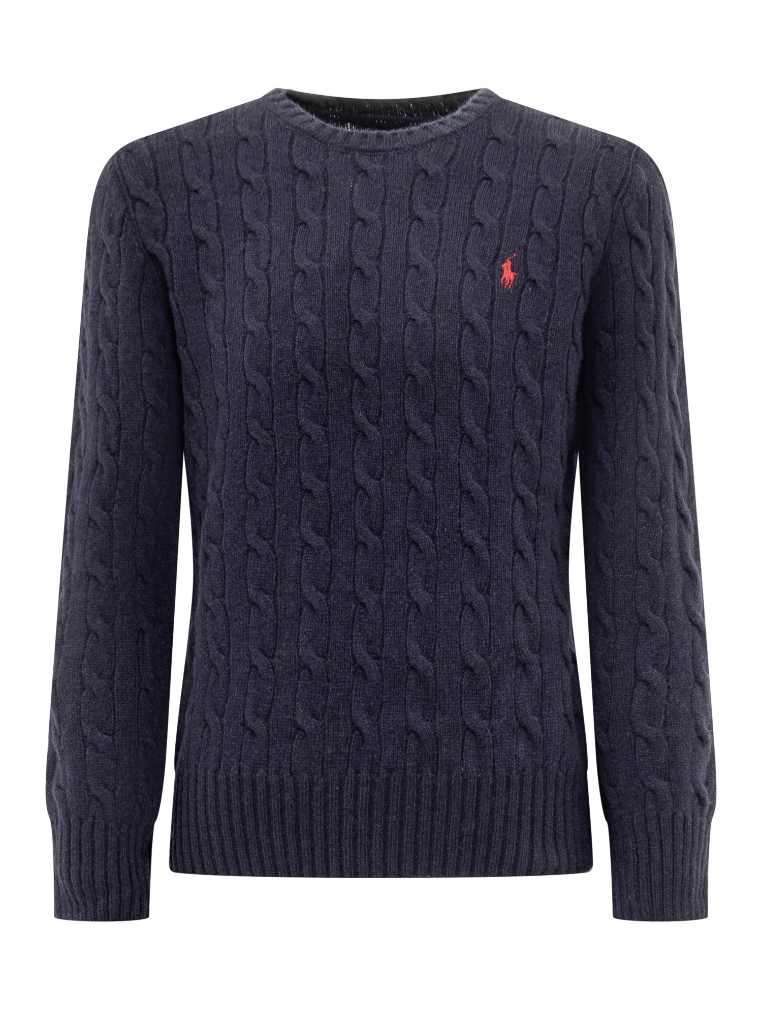Polo Ralph Lauren blue wool sweater featuring a cable knit design and embroidered chest logo.