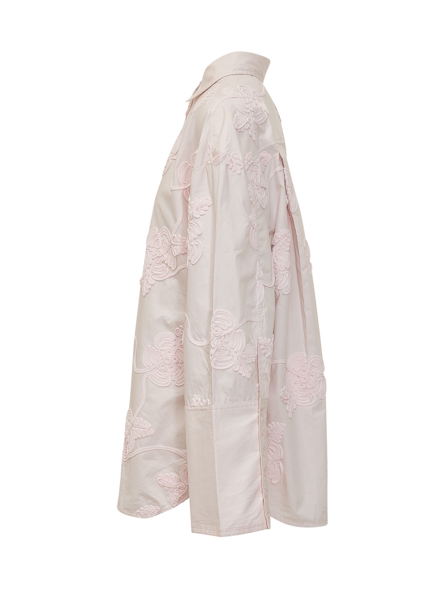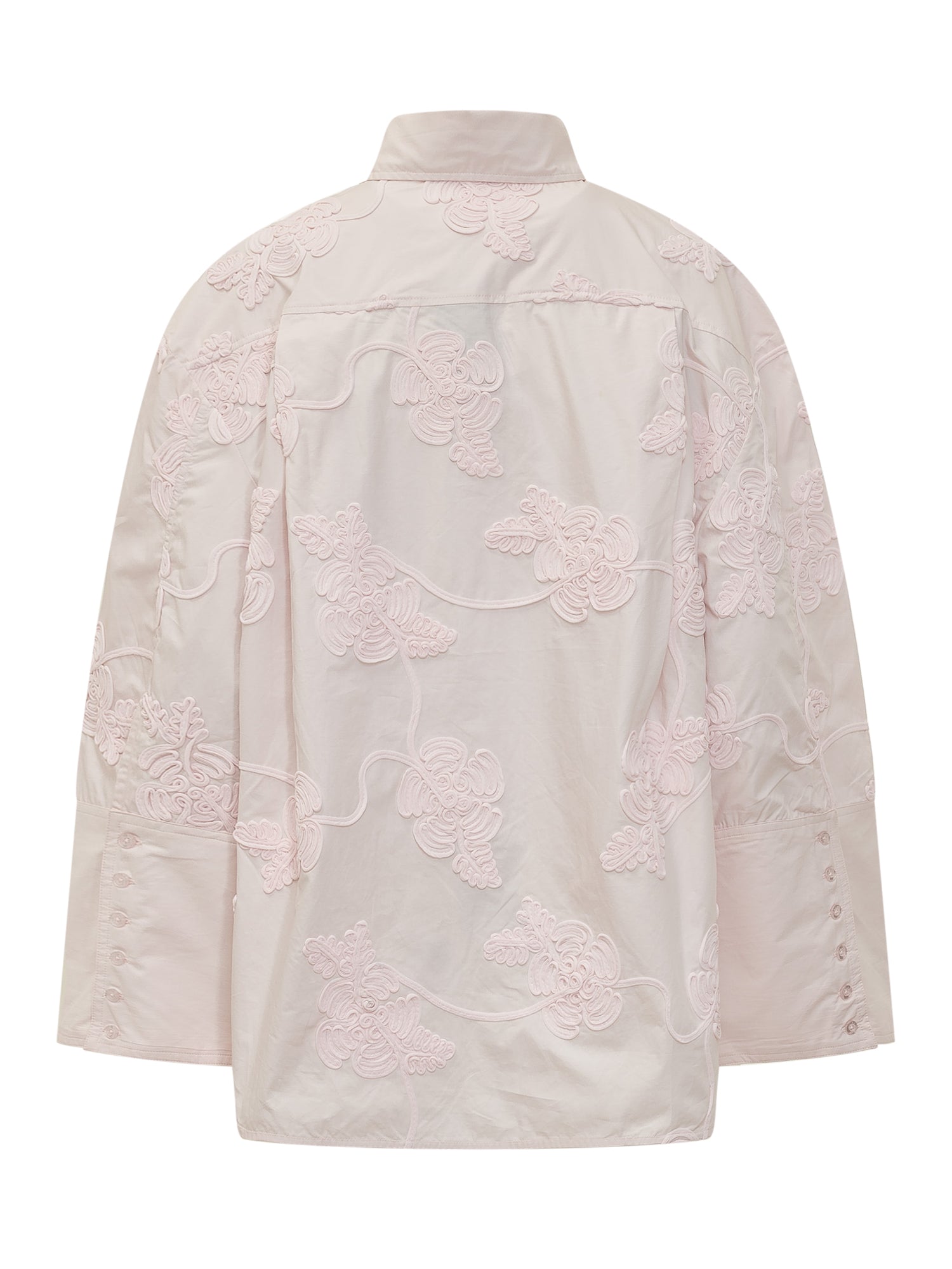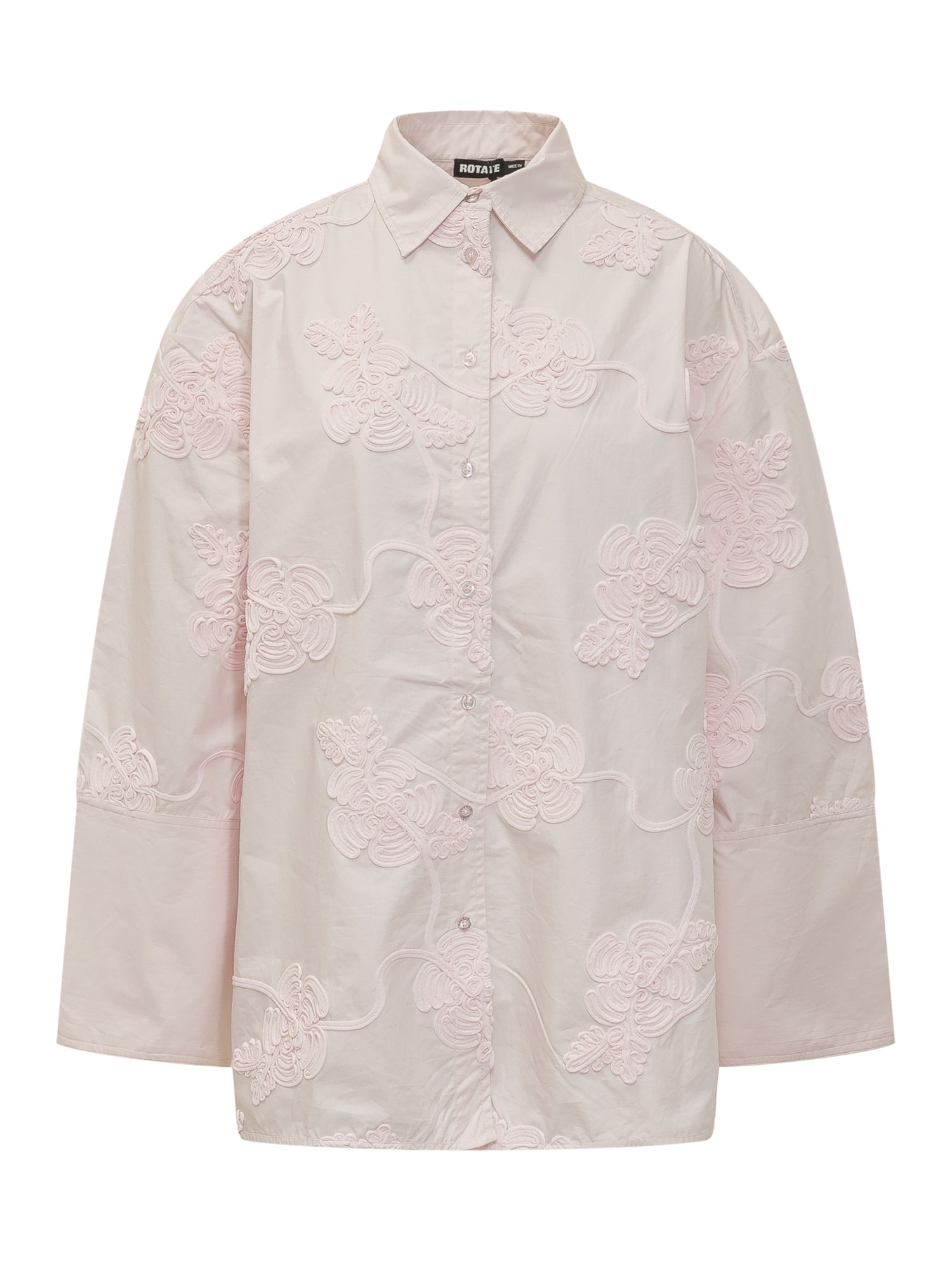 Oversized shirt featuring raised floral embroidery. Relaxed silhouette with classic collar, front button closure and long sleeves. A refined piece blending femininity with a modern attitude.