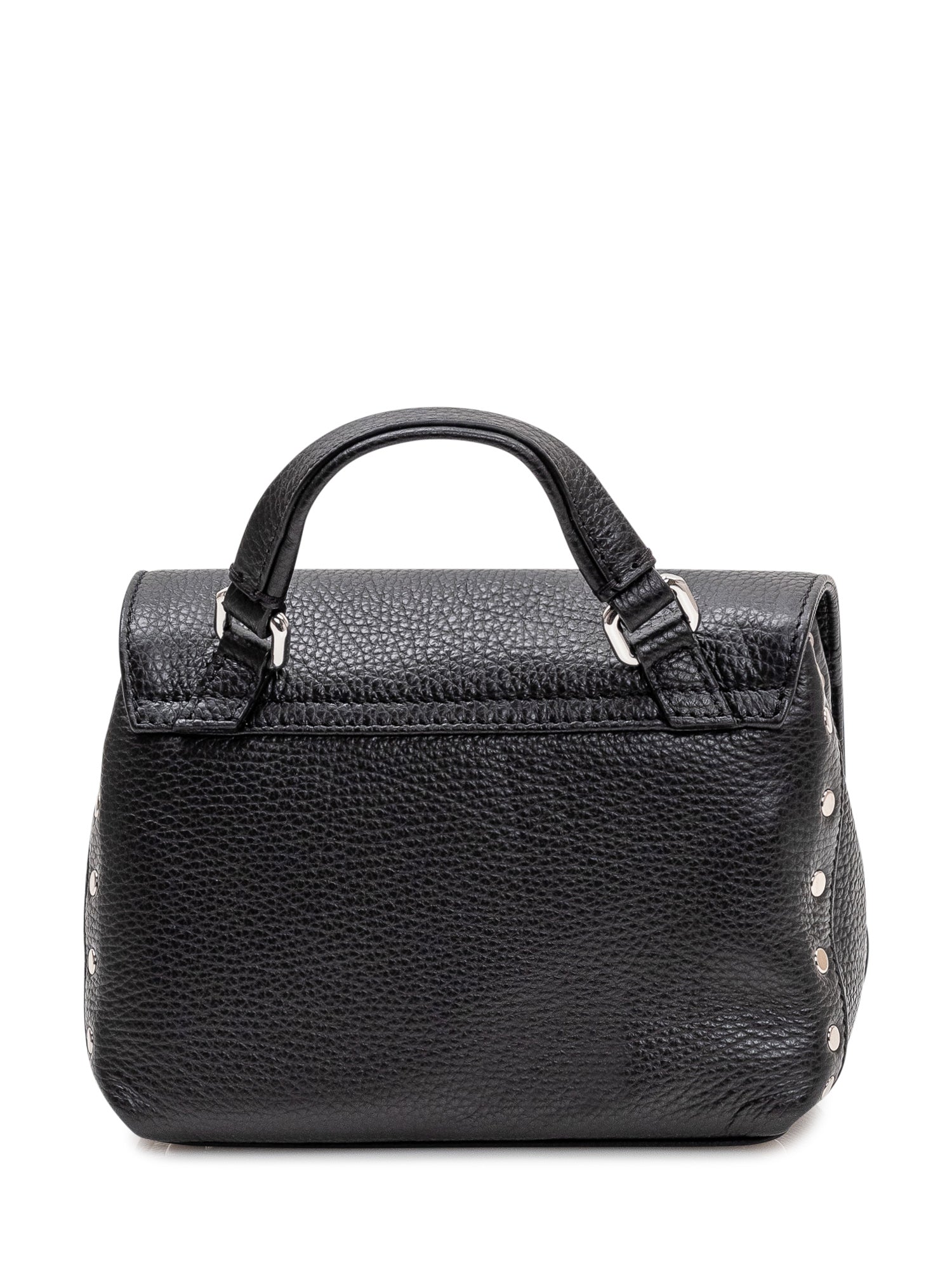 Compact top-handle bag in grained leather with front flap and iconic double clasp closure.Size: 7.87x5.51x4.33