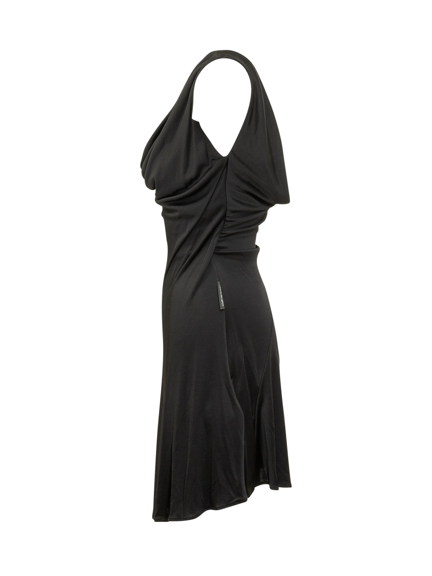 Fluid jersey midi dress featuring a draped wide neckline and sleeveless design. Flared silhouette with asymmetric panels and lettering print at the hem.