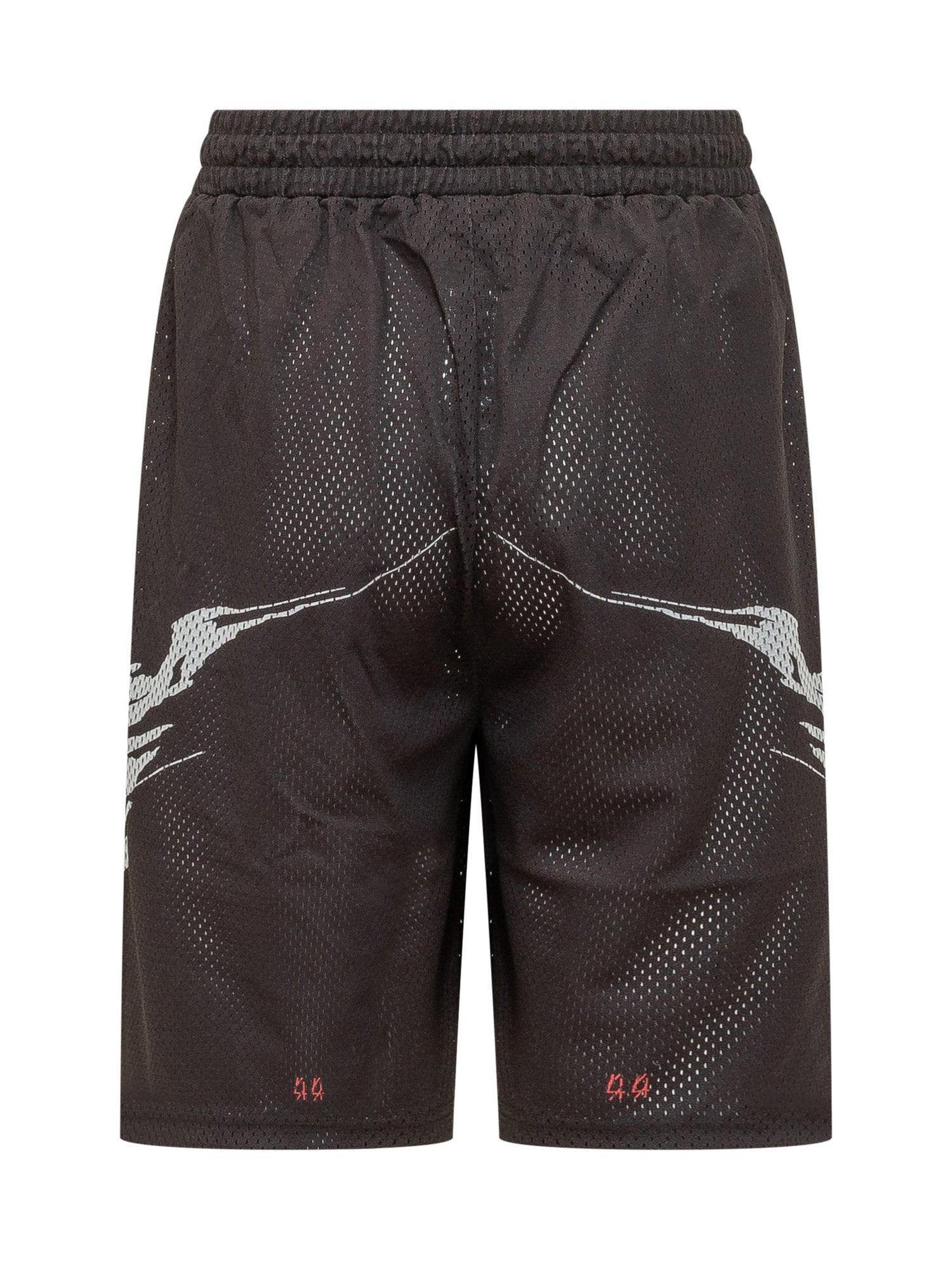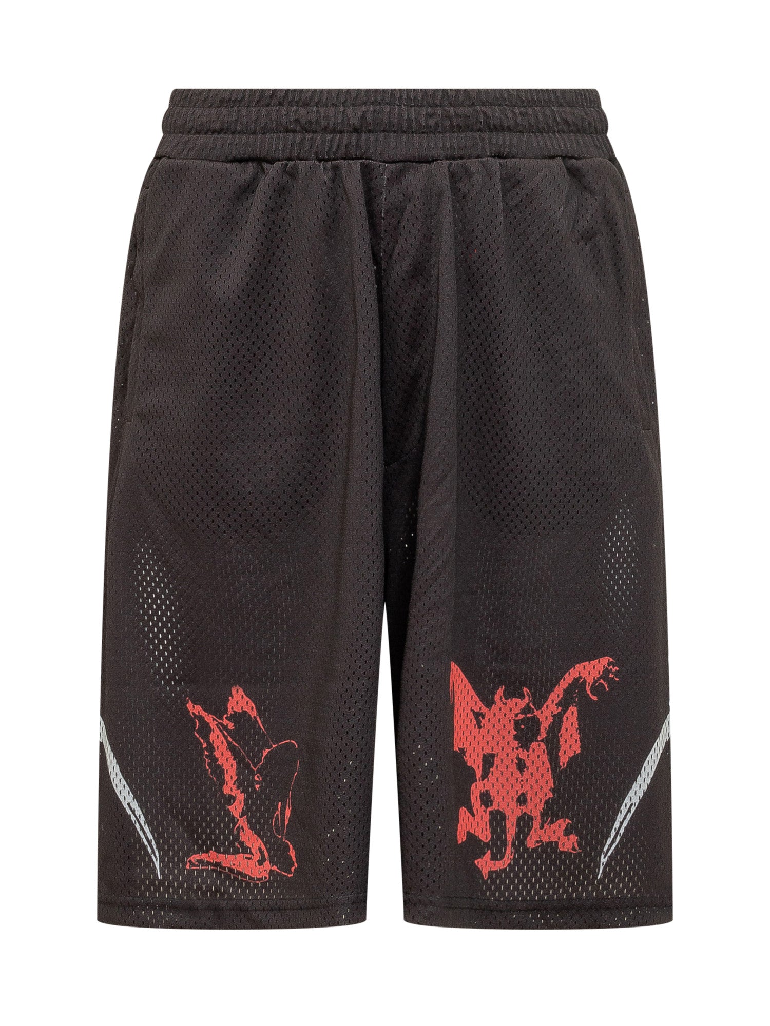 Breathable mesh sweatshorts, elastic waist, side pockets, graphic print on legs.