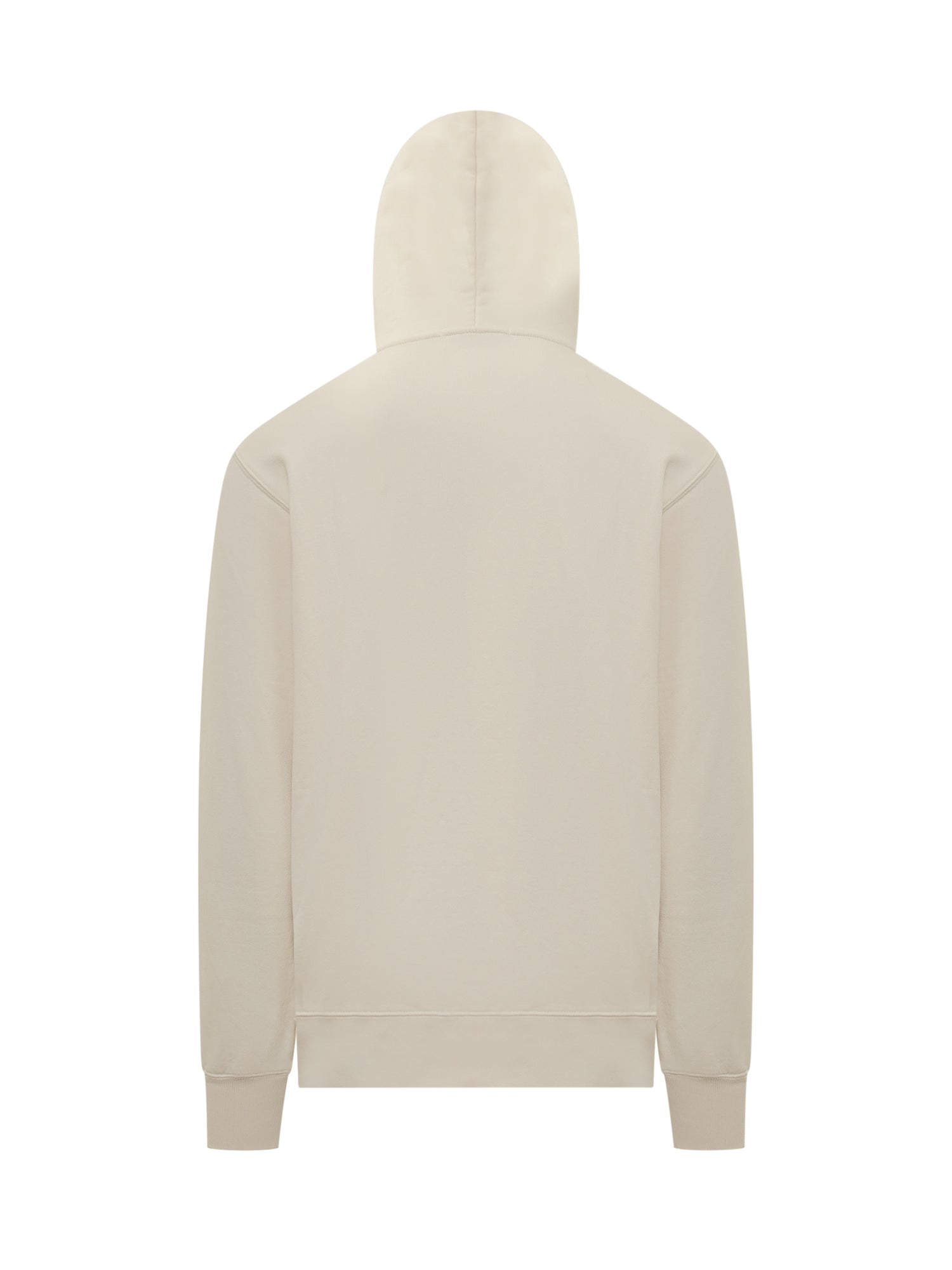 Boxy fit long sleeve hooded sweatshirt. Ribbed hems. Two pockets on front. Metal bead necklace attached at neck. Removable necklace. Embroidered logo on front.