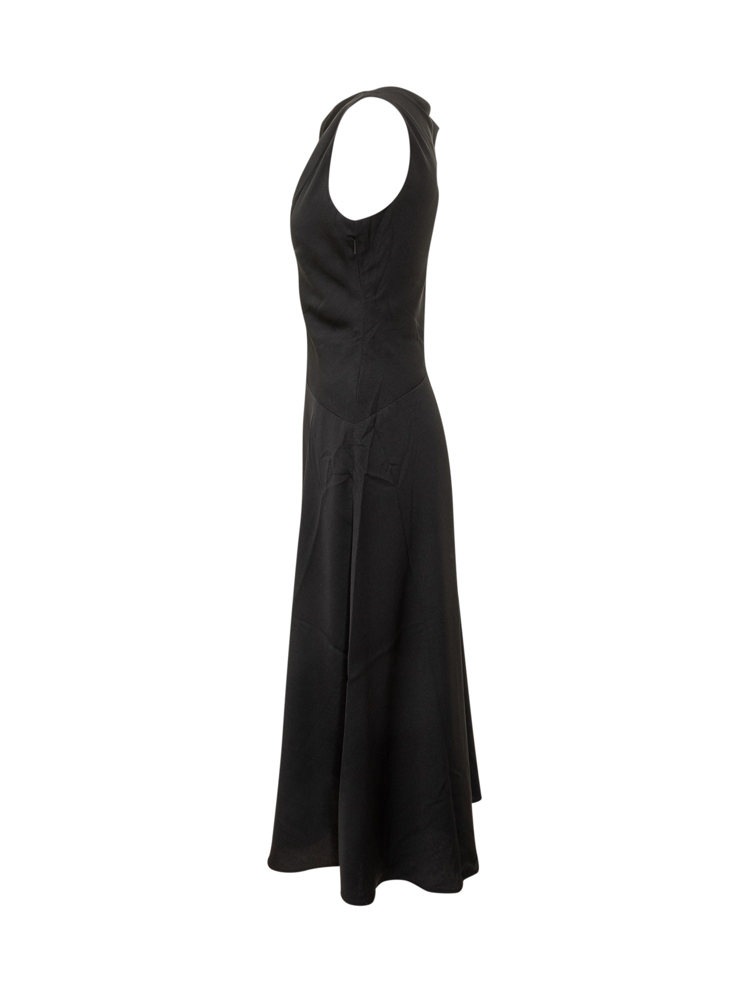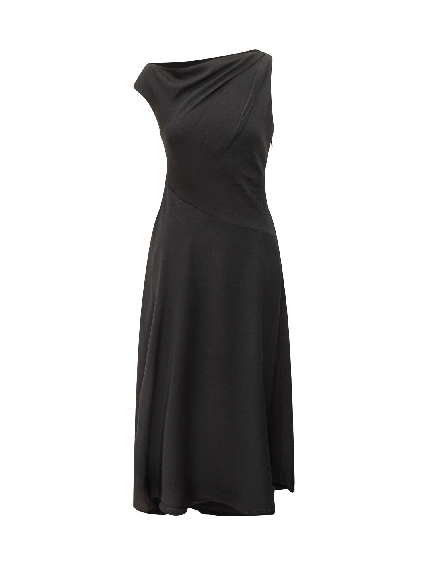 Elegant Calvin Klein black one-shoulder dress with draped detail and flared cut.
