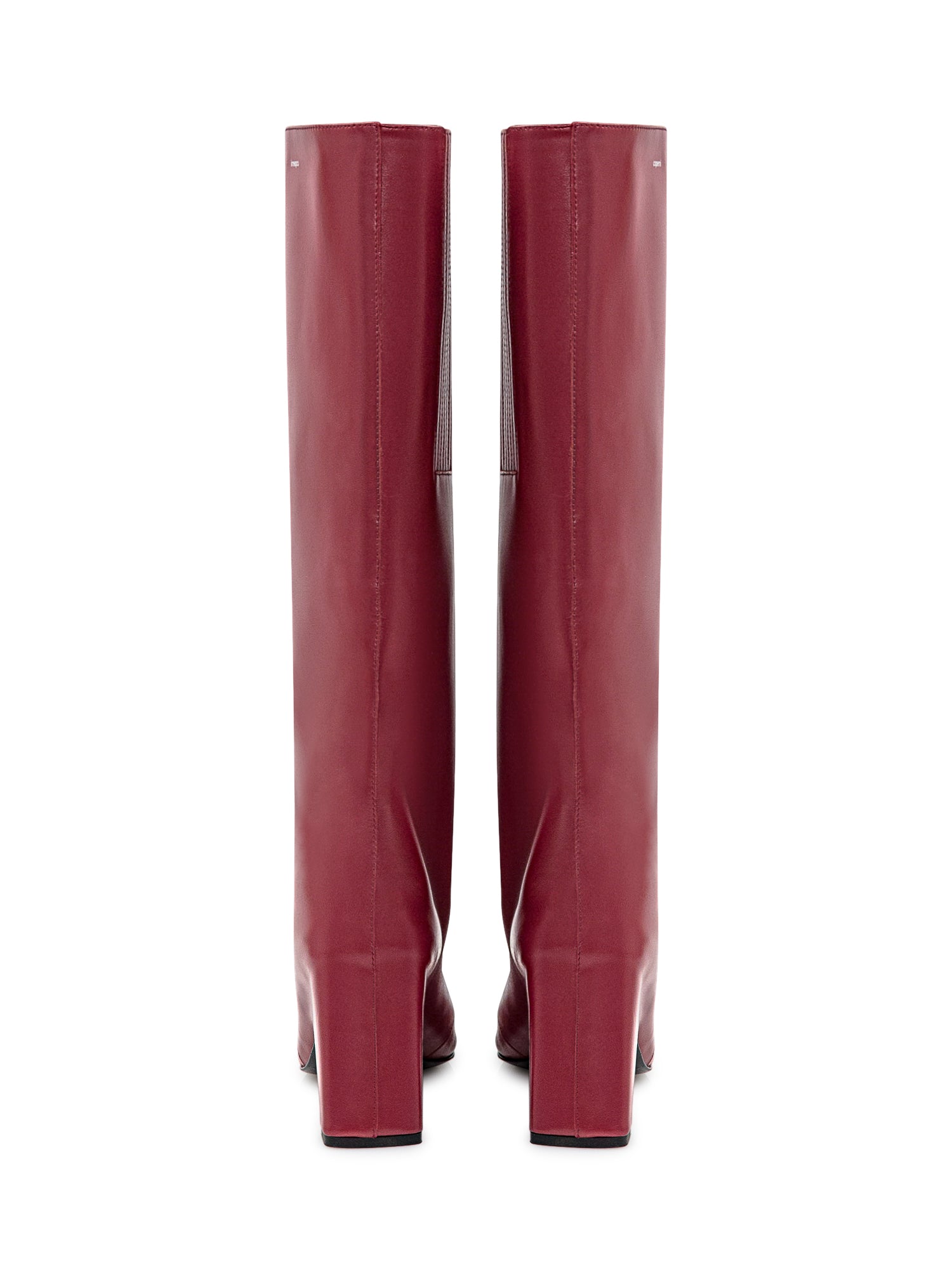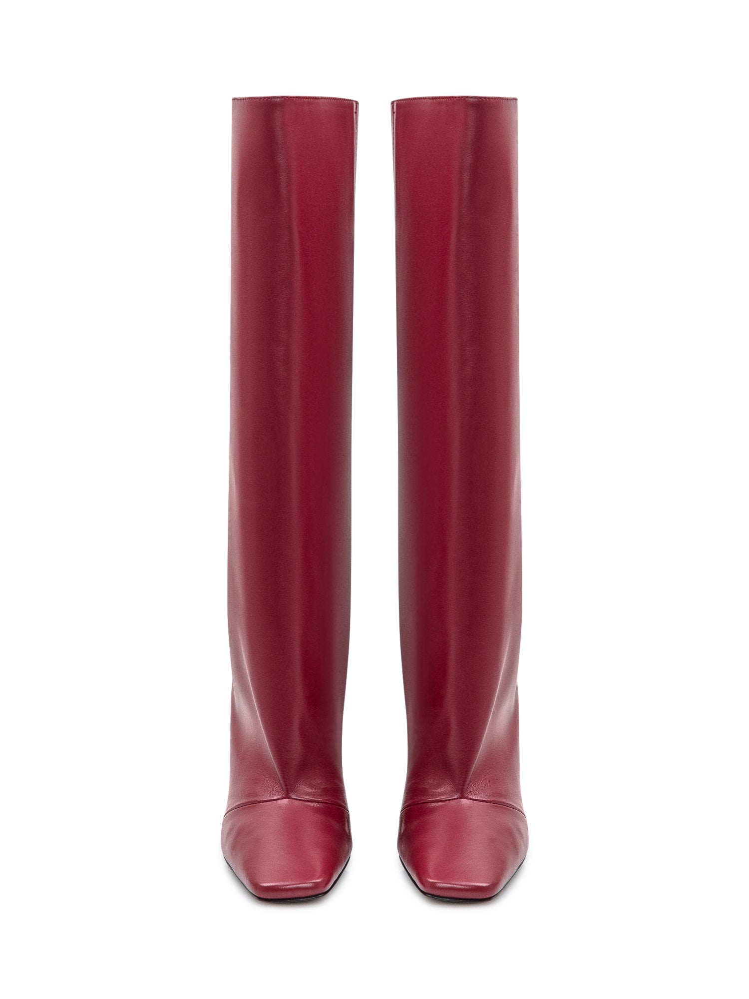 Coperni Bridge boots in bordeaux leather with architectural design and sculptural heel. Essential lines and innovative silhouette for a modern and elegant look.