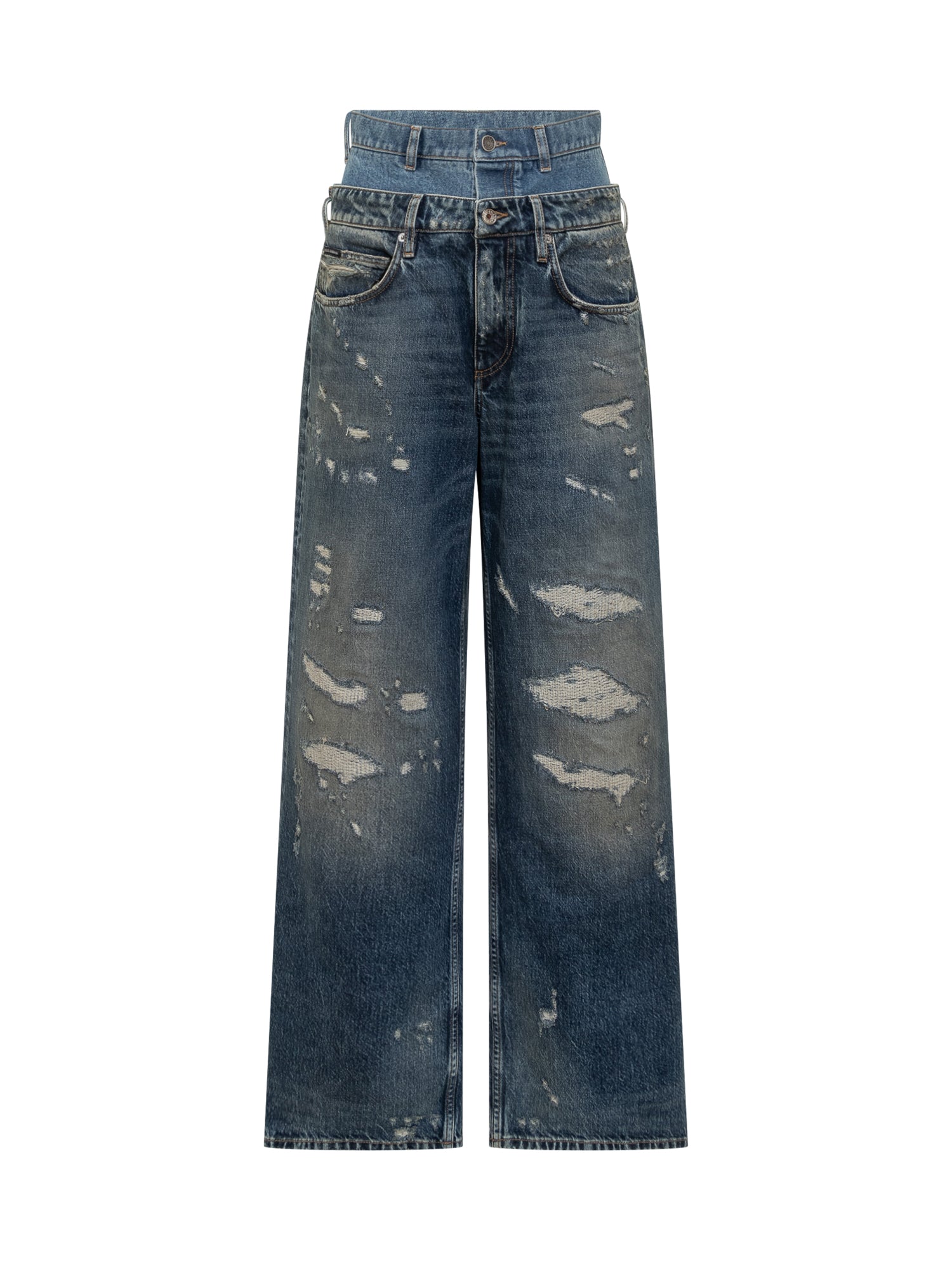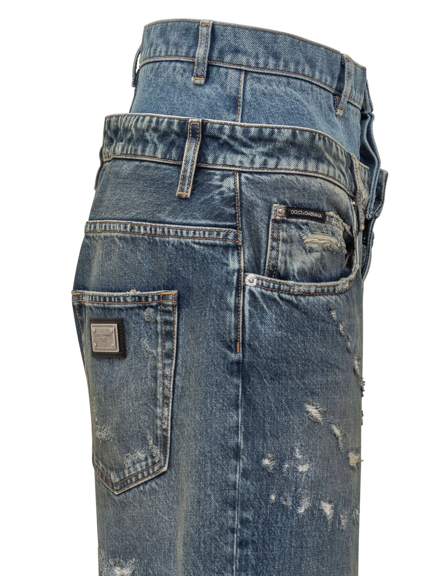 Dolce & Gabbana blue denim jeans with distressed details and double waistband layered effect.