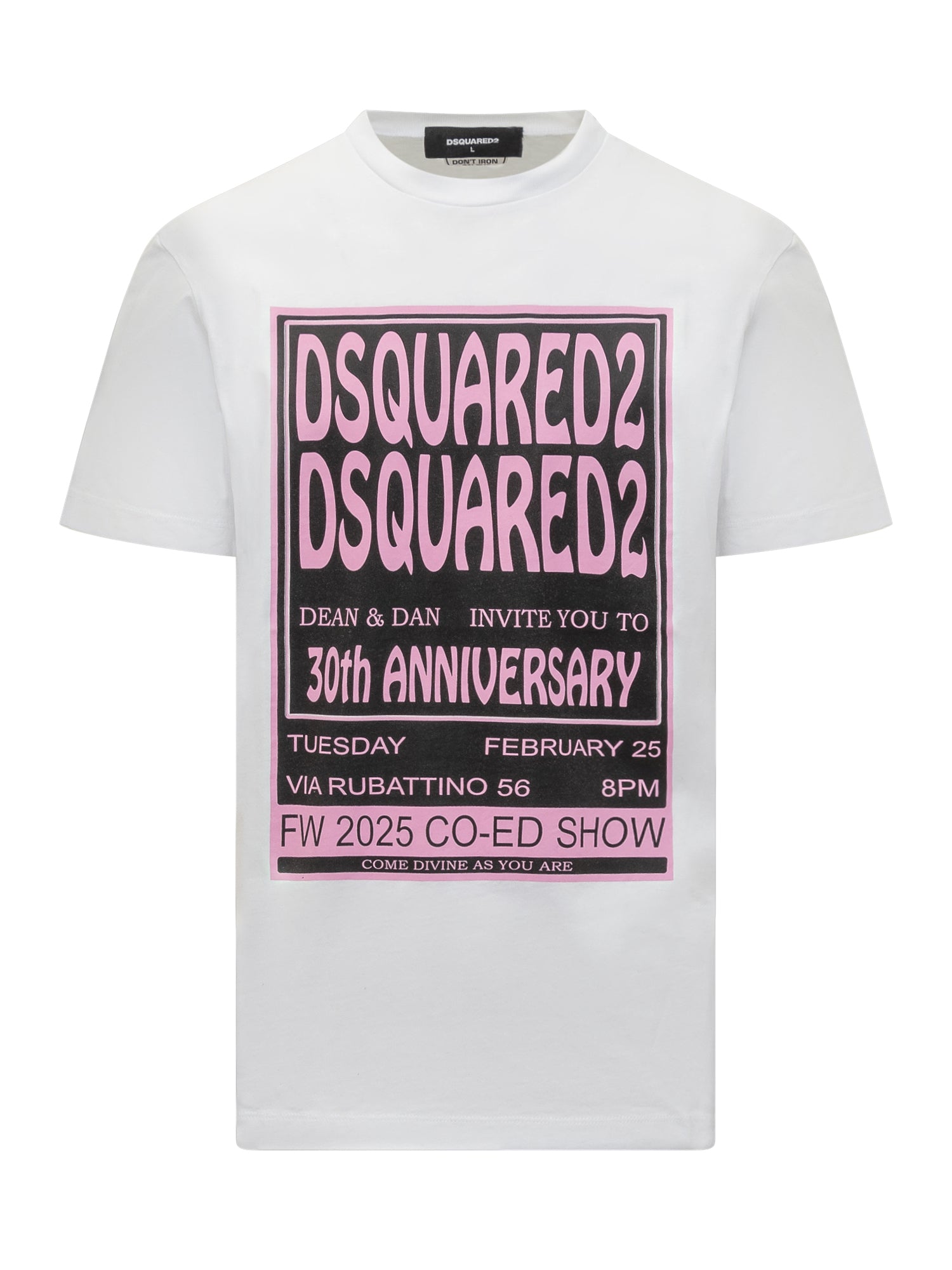 Dsquared2 white cotton T-shirt with pink and black graphic front print celebrating the brand's 30th anniversary.