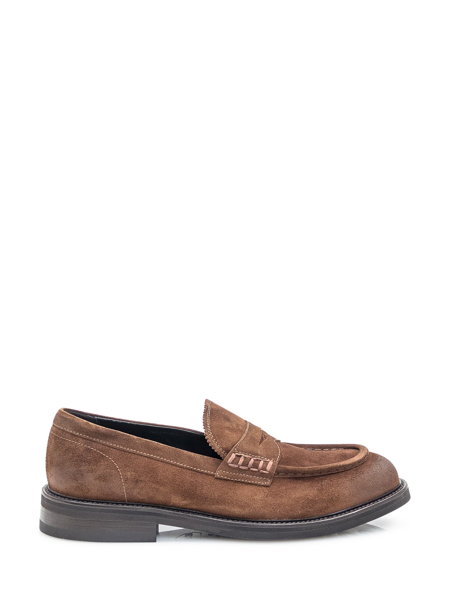 Duca Nero brown suede loafers with penny strap and visible stitching. Leather sole with rubber insert for added durability and comfort.