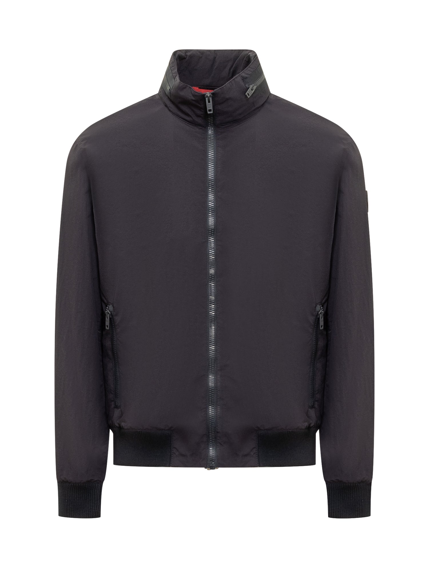 Ultralight windbreaker jacket. High collar. Zipper closure. Ribbed hems. Two pockets on front. Removable hood. Logo patch on sleeve.