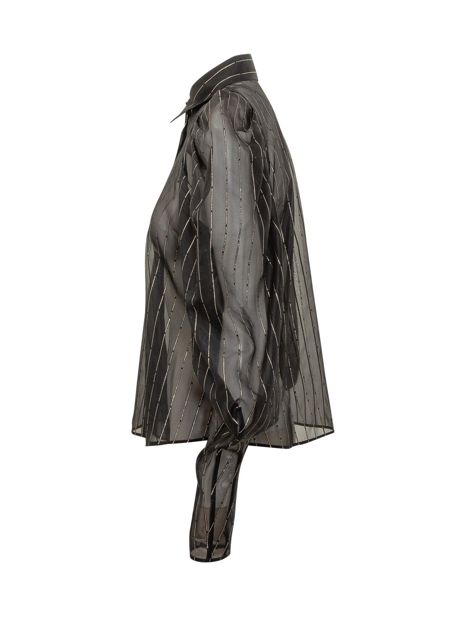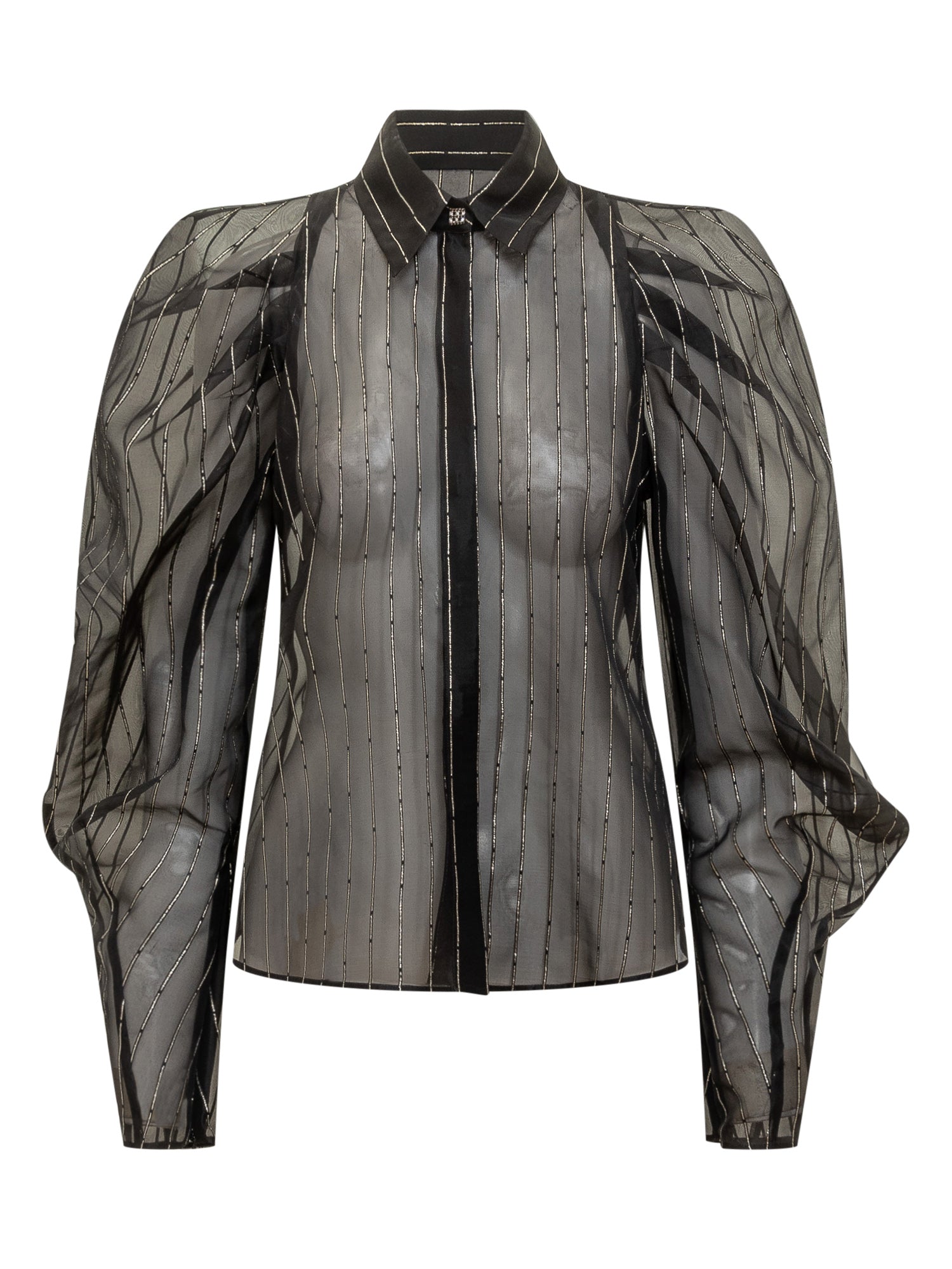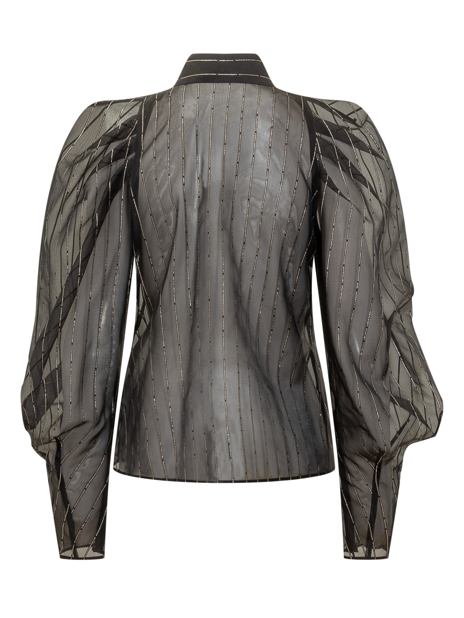 Genny black organza shirt with metallic stripes and puff sleeves. Features a classic collar.
