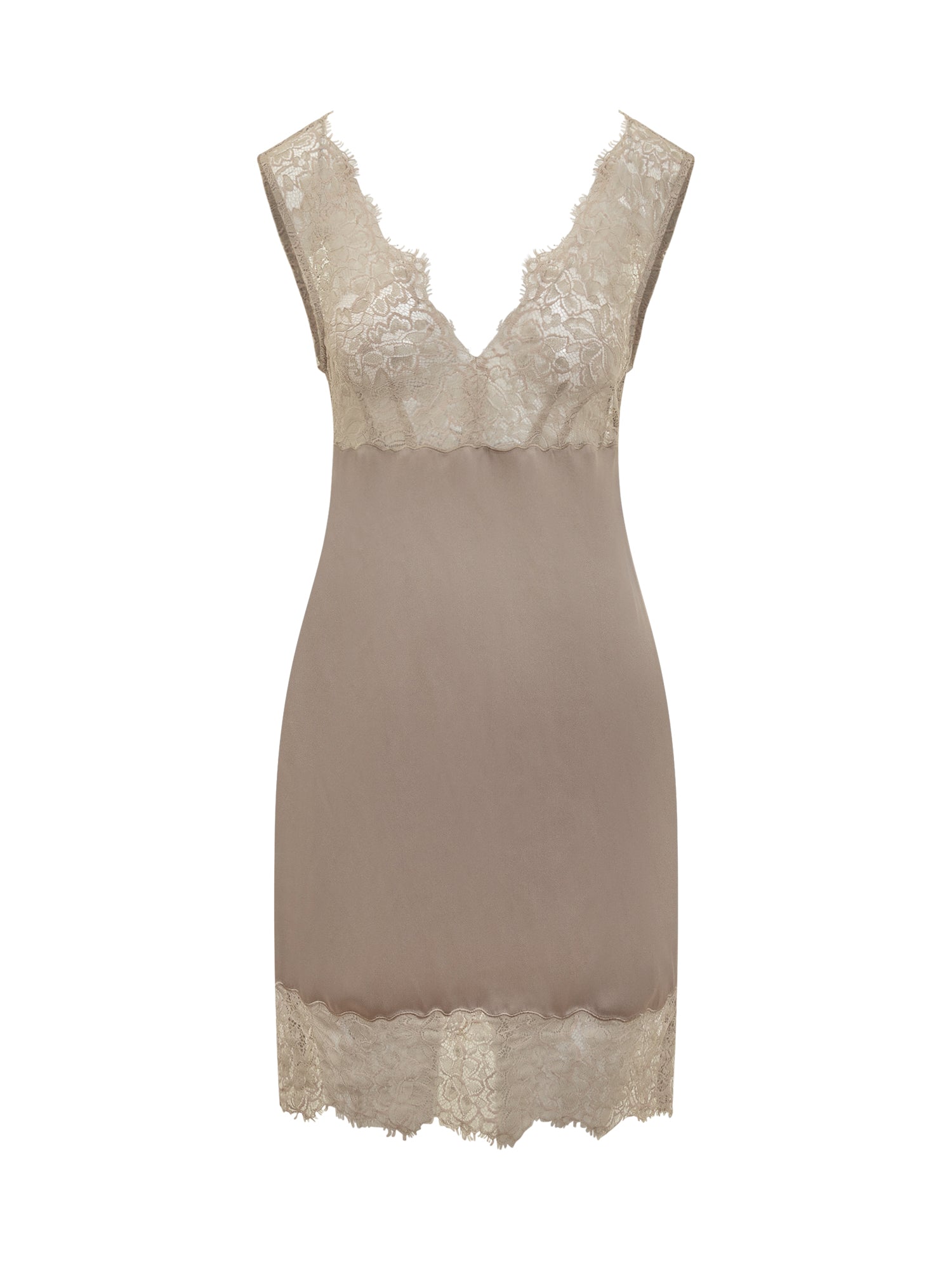 Marella Co-Design short dress in beige satin with floral lace inserts. V-neckline and sheer details.
