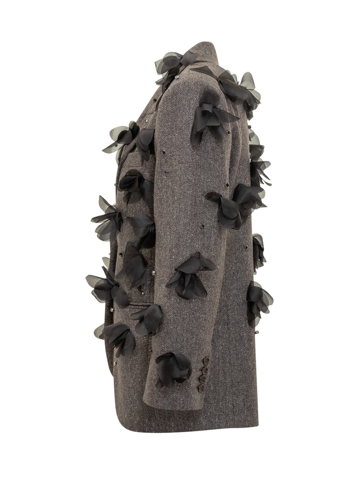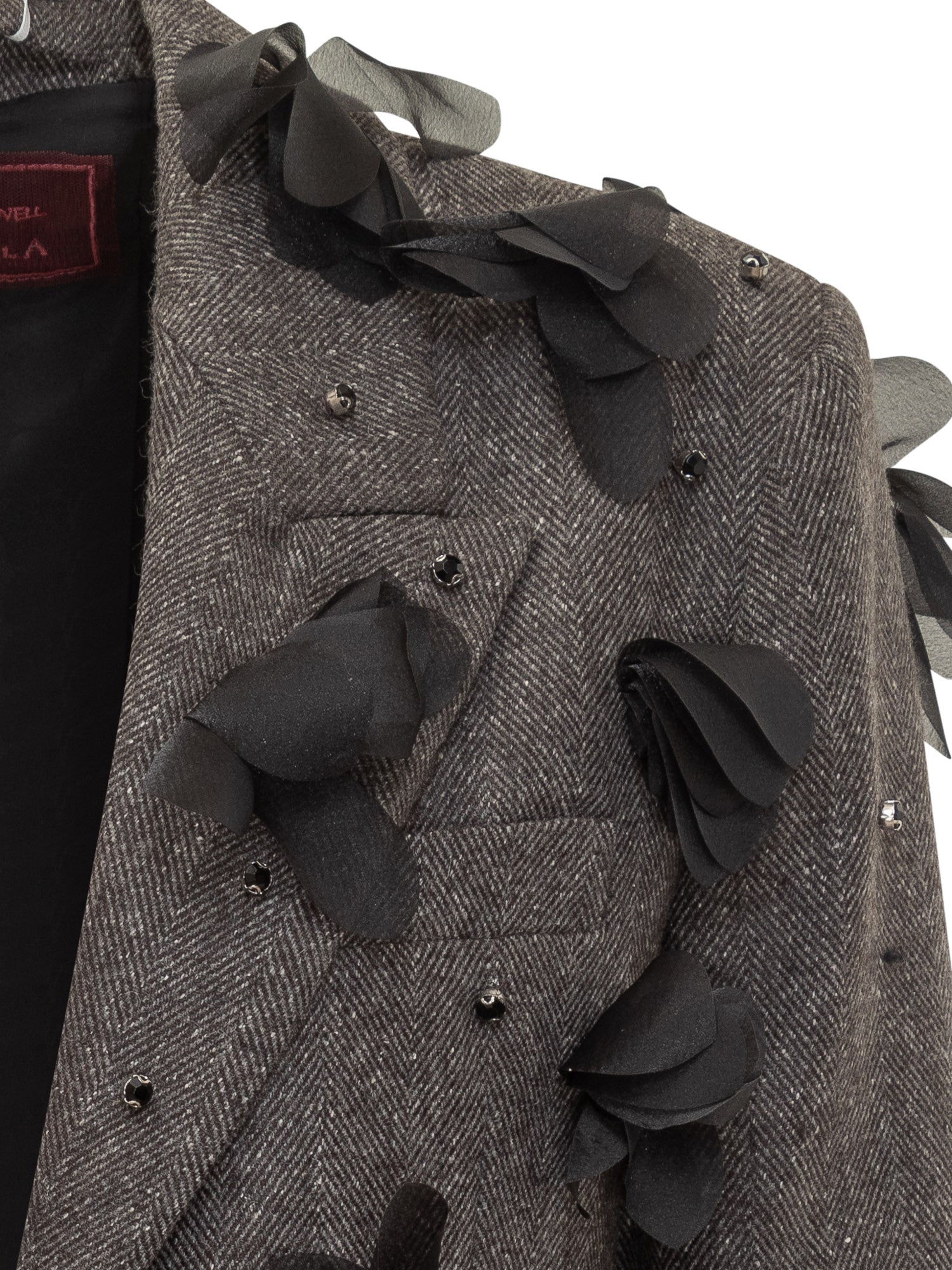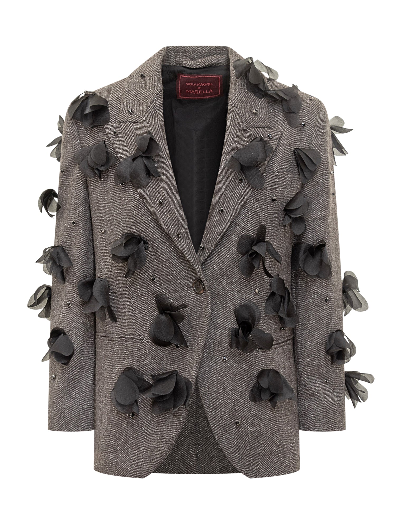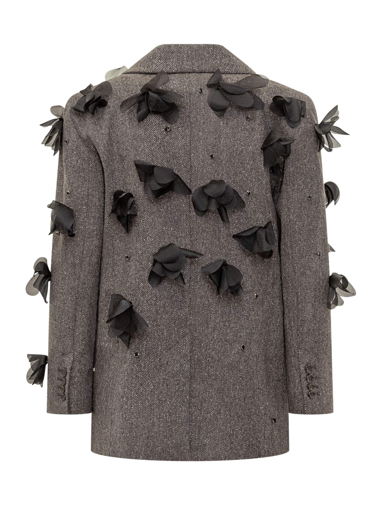 Marella Codesign grey jacket featuring 3D floral appliqués and bead details.