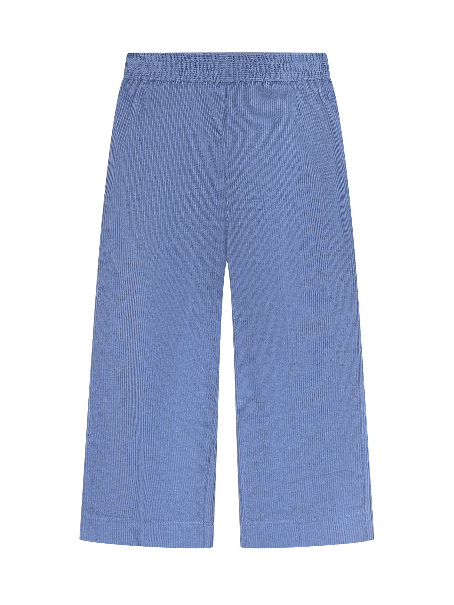 Monnalisa blue corduroy pants with elastic waistband and wide leg design.