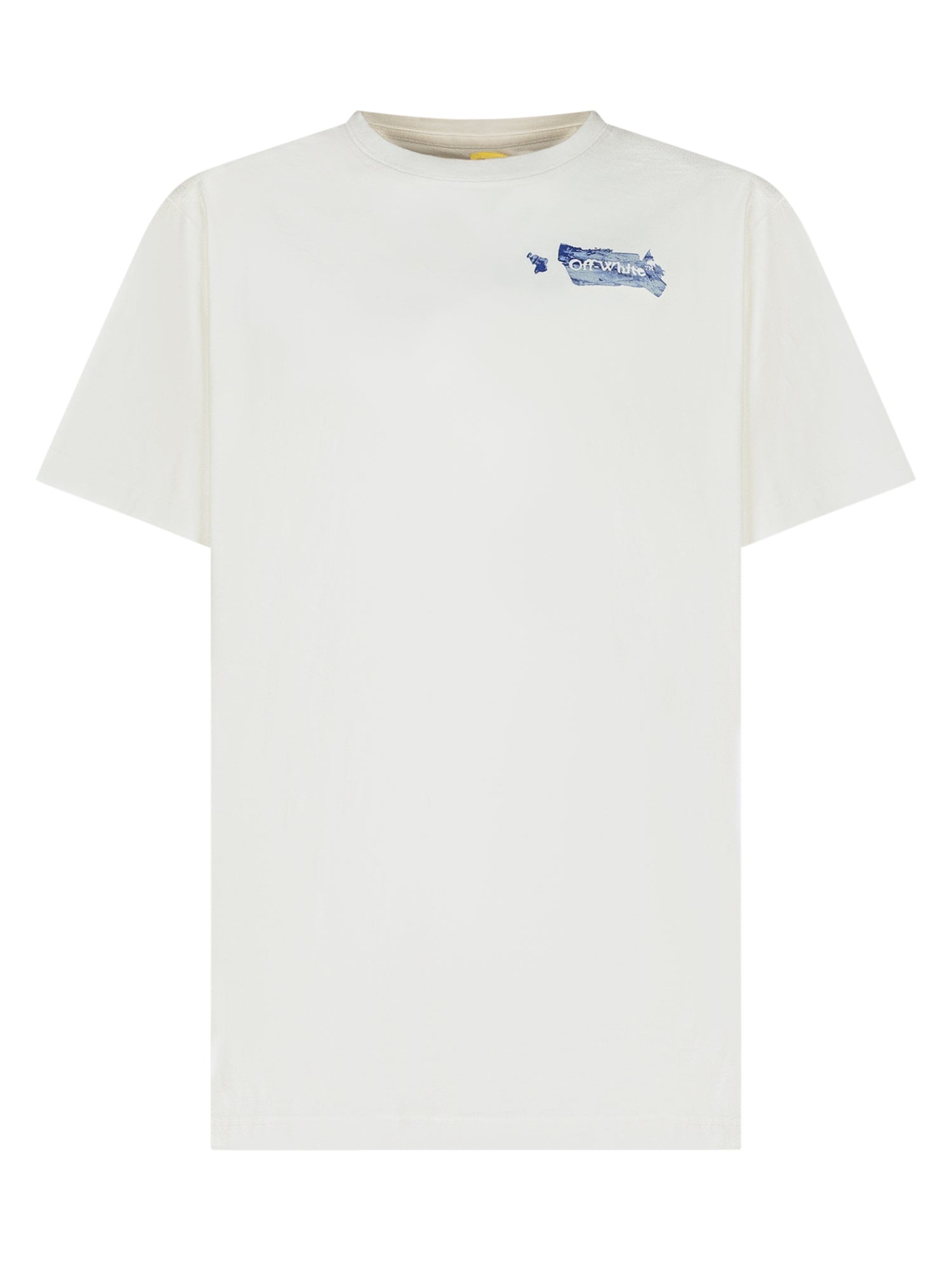 White cotton T-shirt by Off-White Kids. Features blue brushstroke-effect arrows logo on the back and small logo on the chest.