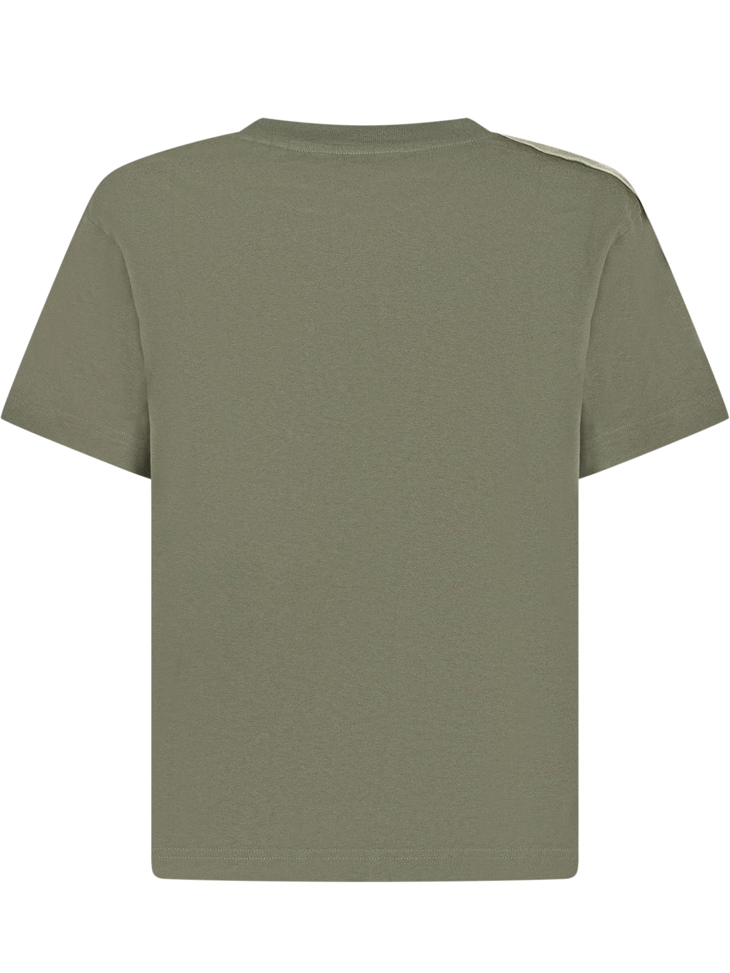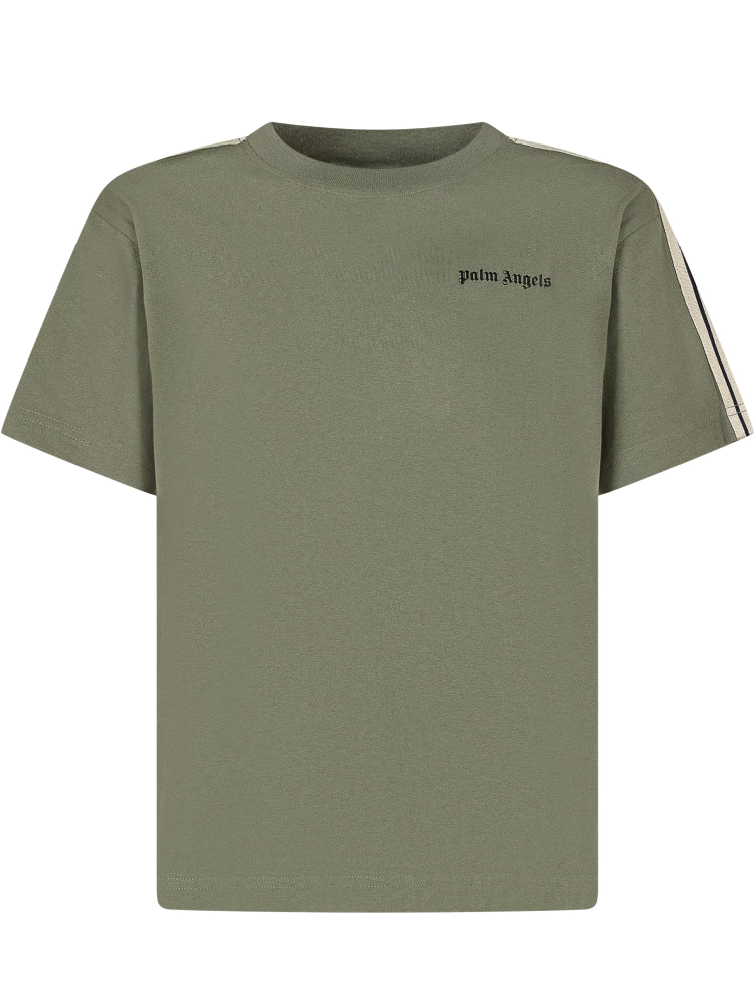 Palm Angels Kids green cotton T-shirt featuring an embroidered logo on the chest and contrasting side stripes along the sleeves.